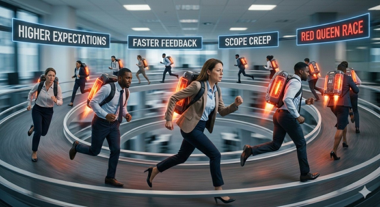 现在的企业也陷入了这种困境:每个人都用AI变快了,所以整个市场的竞争基准线也变高了。大家比以前累了三倍,却只是为了维持不被淘汰的现状。