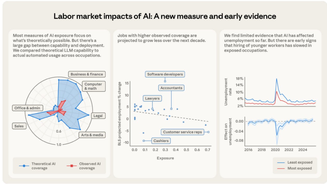 自ChatGPT发布以来,关于人工智能将如何颠覆职场的讨论从未停歇。我们都听说过AI能"理论上"取代多少工作,但实际情况真的如此吗?Anthropic公司在2026年3月5日发布的一份重磅研究报告,为我们提供了一个更贴近现实的视角:它引入了一个全新的衡量指标——“观察到的暴露度”,来评估AI对劳动力市场的实际影响,而非仅仅是理论上的可能性。