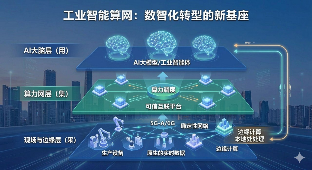 在解析《通知》时,一个被高频提及的痛点是工业数据"采"与"集"的瓶颈。这引出了我们今天要探讨的核心概念——工业智能算网(Industrial Intelligent Computing Network)。
