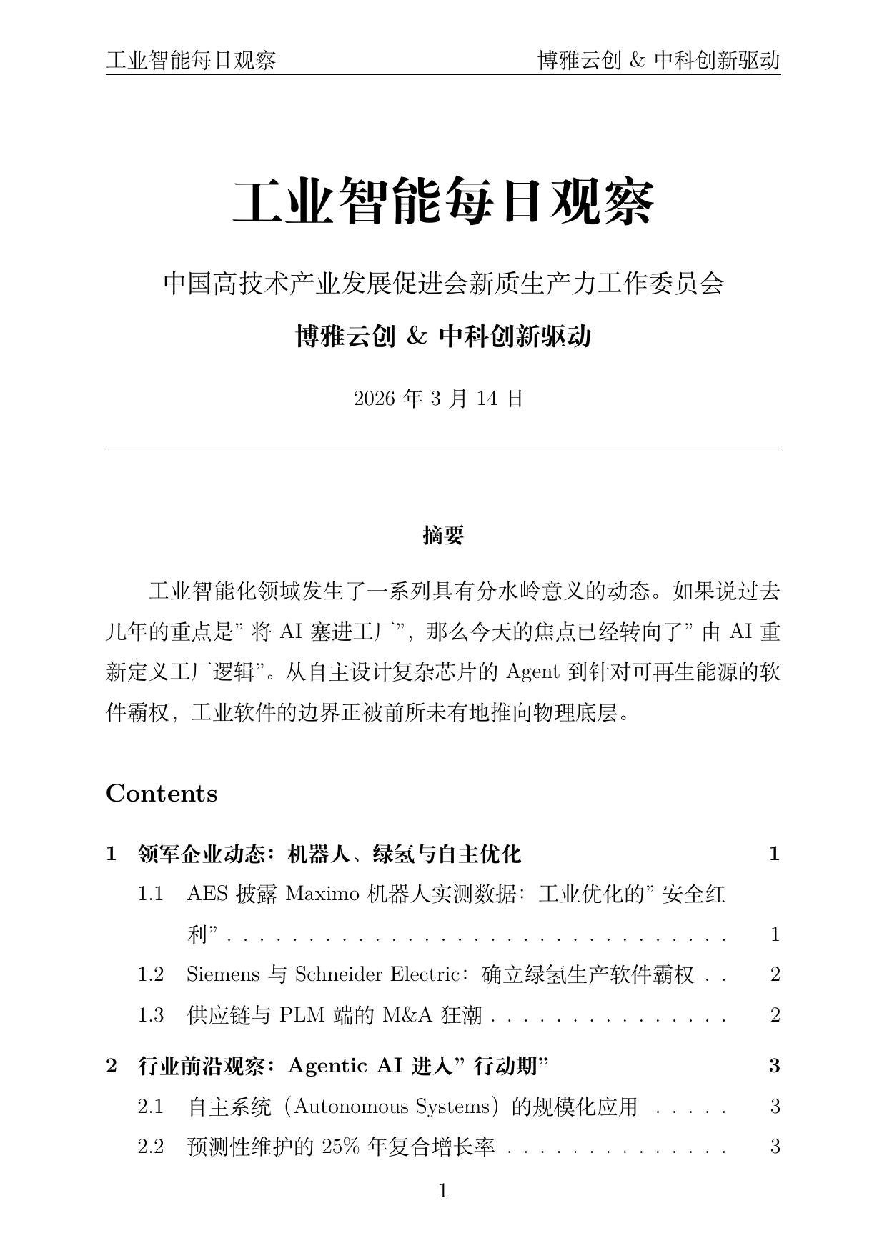 2026年3月14日的动态清晰地展示了:工业智能已进入"物理感知(Physical Awareness)"阶段。AES 的 Maximo 证明了 AI 可以处理户外复杂重体力活;Design Conductor 证明了 AI 正在接管设计权;而西门子与施耐德在绿氢领域的博弈,则揭示了未来 10 年的工业软件皇冠属于谁。
