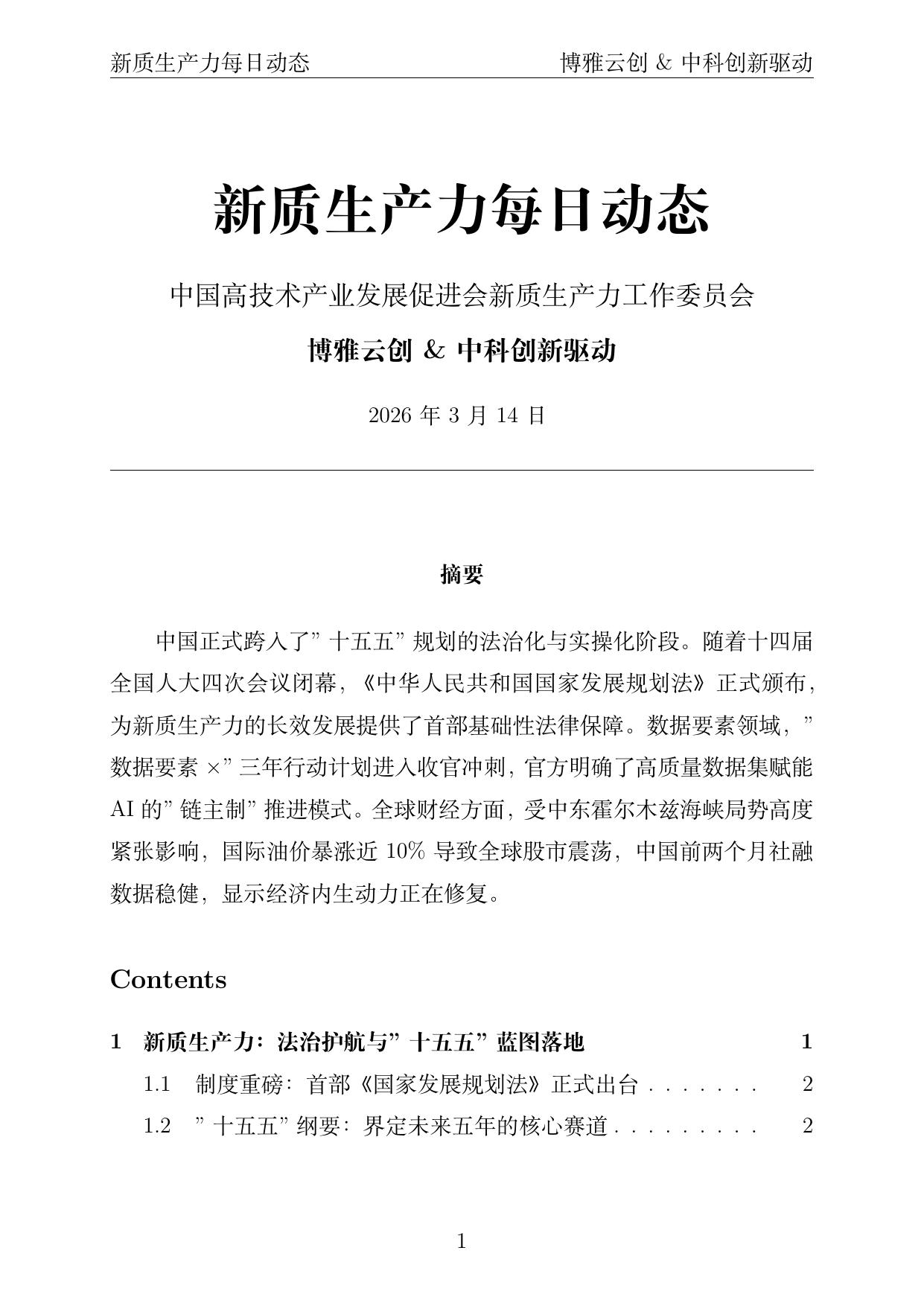 过去24小时(2026年3月13日-14日),新质生产力的讨论重心已从两会提案转向法律确认与规划实施。