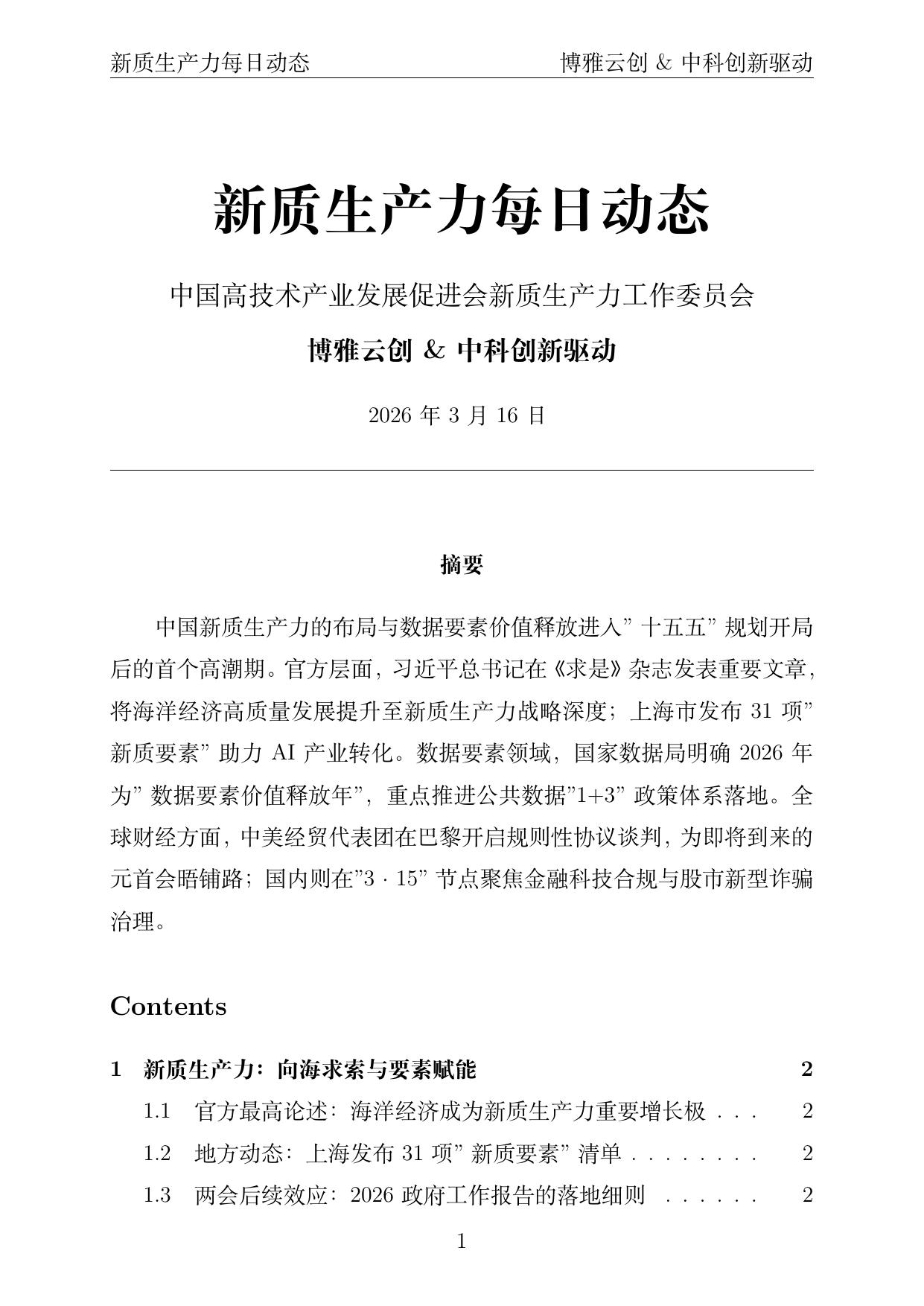 中国新质生产力的布局与数据要素价值释放进入"十五五"规划开局后的首个高潮期。官方层面,习近平总书记在《求是》杂志发表重要文章,将海洋经济高质量发展提升至新质生产力战略深度;上海市发布31项"新质要素"助力AI产业转化。数据要素领域,国家数据局明确2026年为"数据要素价值释放年",重点推进公共数据"1+3"政策体系落地。全球财经方面,中美经贸代表团在巴黎开启规则性协议谈判,为即将到来的元首会晤铺路;国内则在"3·15"节点聚焦金融科技合规与股市新型诈骗治理。