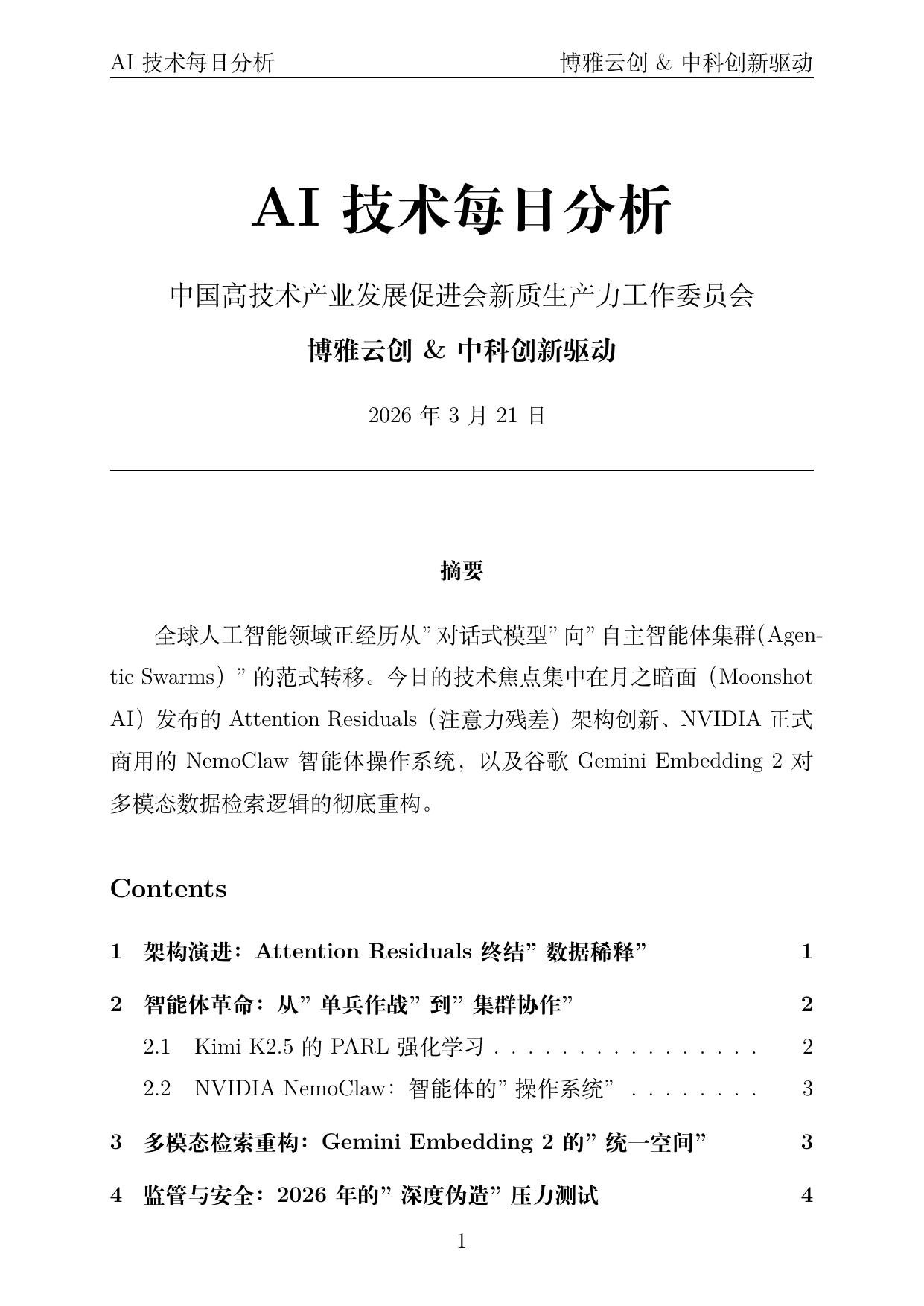 2026 年 3 月 21 日的 AI 景观呈现出明显的"工程化成熟"特征。我们不再仅仅关注模型是否能对话,而是在关注它如何高效地组织(AttnRes)、如何安全地行动(NemoClaw)、如何并行协作(PARL)以及如何跨感官理解世界(Embedding 2)。