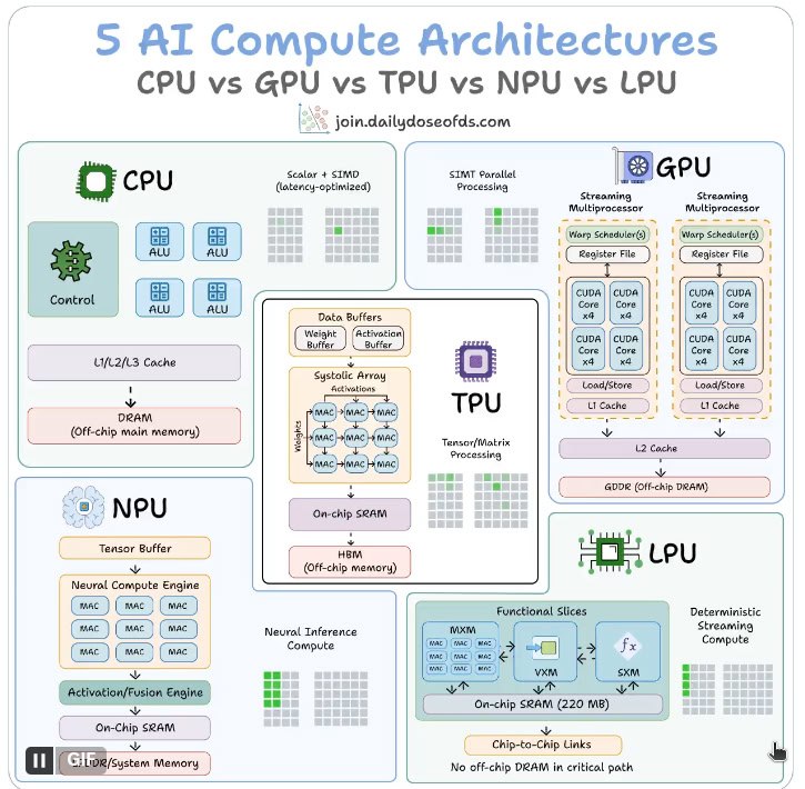 在人工智能爆发的今天,一场硬件革命正在悄然发生。从 ChatGPT 的实时对话,到手机上的 AI 图像生成,再到数据中心的万亿参数大模型,背后都离不开专用计算硬件的支撑。2026 年 3 月,AI 教育者 Avi Chawla 在 X(原 Twitter)上发布了一条爆款帖子,用一张视觉图表直观对比了 CPU、GPU、TPU、NPU 和 LPU 五种架构,强调它们在"灵活性、并行性和内存访问"上的核心权衡。这篇文章正是基于该帖子的深度扩展,我们将用通俗却不失技术深度的语言,带你拆解每一种芯片的内部逻辑、设计哲学、优缺点,以及真实应用场景。