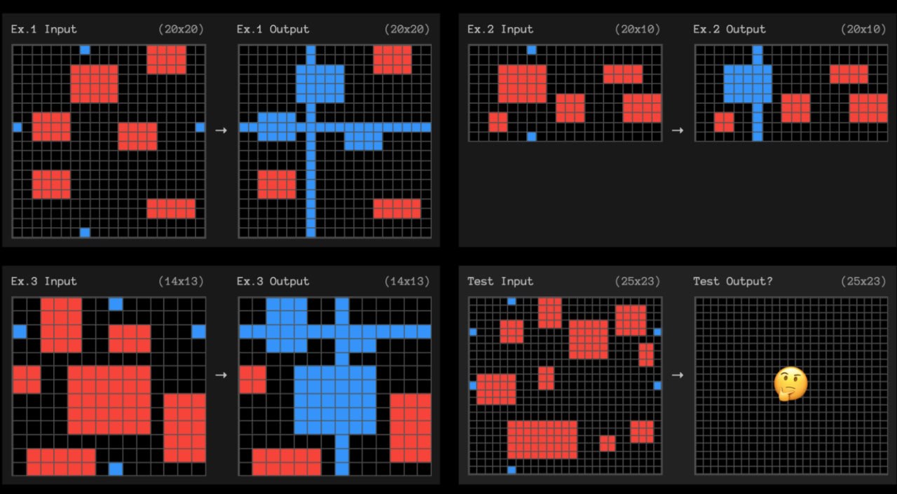 给AI几对输入-输出彩色网格(3x3到30x30),让它推断隐含规则并生成新网格。任务基于人类"核心知识先验"(Core Knowledge Priors),如物体性(objectness)、几何、物理、直观因果等,无需语言或文化知识。人类轻松100%,早期AI接近0%。