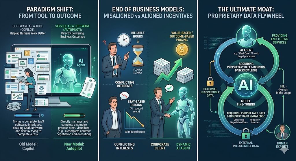 当你只是一家SaaS软件公司时,你的系统里流淌的只是用户在界面上的点击日志。但当你像Crosby一样,作为一家服务机构直接接管客户的合同谈判;或者像各种AI财税机构一样,直接为企业处理账目时,你将接触到基础大模型(Foundation Models)在公共互联网上永远无法抓取到的核心机密数据与行业暗知识。