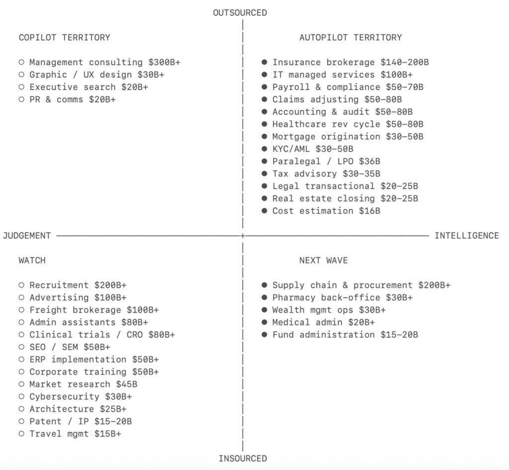 因此,红杉为"服务即软件"的创业者指明了一条最平滑、最聪明的切入路径:精准狙击价值数千亿美元的外包(Outsourced)市场。