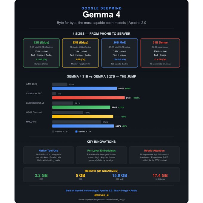 2026年4月2日,Google DeepMind在X平台上正式发布Gemma 4开源模型家族。这一次,他们直接把"字节对字节最强开源模型"的标签打了出来。Gemma 4全系采用Apache 2.0许可协议,任何开发者、企业甚至个人都能自由下载、修改、商用、部署,完全没有以往开源模型常见的商业限制。这意味着,你可以在自己的笔记本电脑、手机甚至树莓派上运行曾经只有云端大模型才能驾驭的高级推理和自主代理工作流。Gemma 4不是简单的参数堆砌,而是DeepMind从Gemini 3研究中提炼出的"每参数智能"极致优化成果,真正把前沿AI带到了每个人身边。