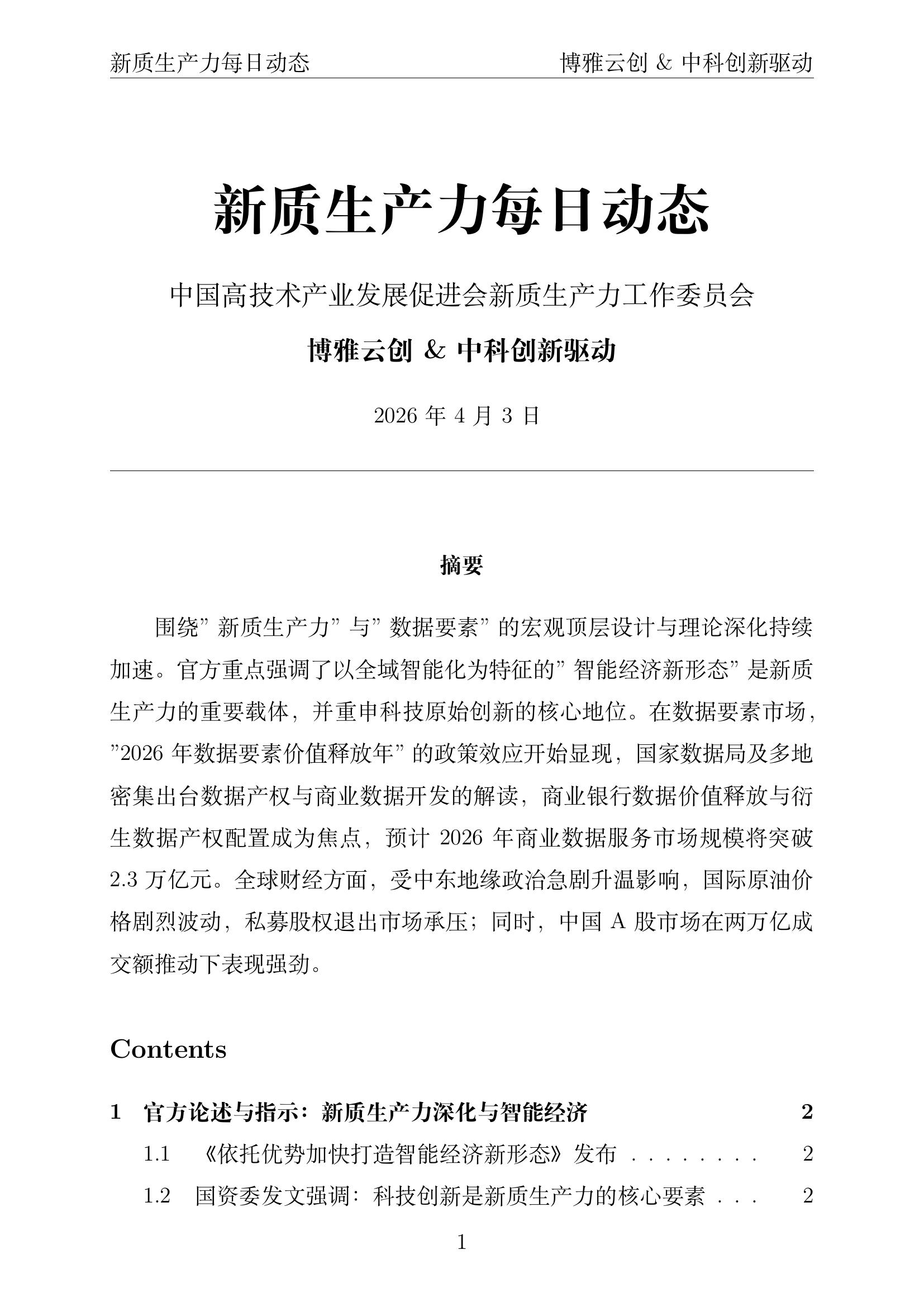 动态内容:2026年4月2日,《求是》网与新华网同步刊发重要论述,明确提出"智能经济新形态"是发展新质生产力的重要载体和推动高质量发展的重要引擎。文章指出,智能经济具有"全域智能化"的基本特征,是以人工智能为重要引擎、以数据为关键生产要素、以算力为新型基础设施的新经济形态。未来政策导向将着重推进算网融合,降低全社会用算成本,让算力像水和电一样便捷使用,同时前瞻布局6G与智算等新型信息基础设施 [1]。