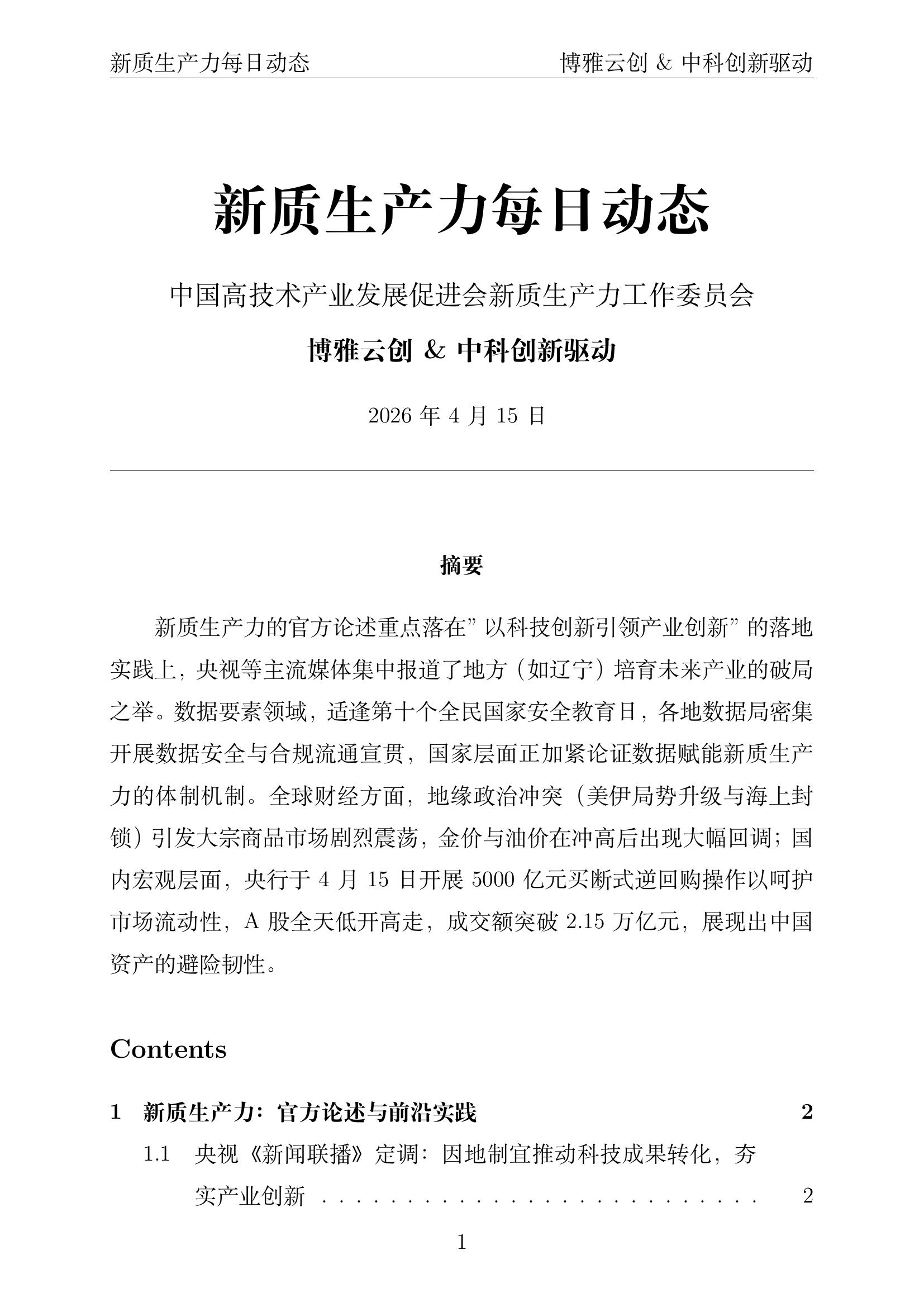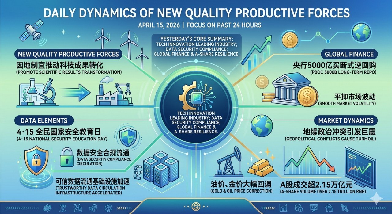 4月15日,多所顶尖智库与官方研究机构同步发声。清华大学中国发展规划研究院等学术单位围绕"新质生产力与2026年经济工作"展开深度研讨,进一步向市场释析了新质生产力的基本框架体系。会议定调指出,新质生产力本身就是绿色生产力,2026年全年的宏观经济工作必须将绿色科技创新、先进绿色技术推广应用作为培育新质生产力的底层基础。同时,文旅等国家部委也在4月15日前后召开专题会议,强调构建"数实融合"新业态,利用文化数据资产赋能高质量发展。