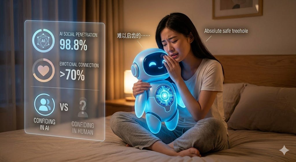 调研数据显示,中国青年对 AI 社交的渗透率高达 98.8%。这已经不是极客圈的小众玩具,而是正在全面接管年轻一代数字生活的基础设施。更值得深思的是,超过七成的受访者表示自己与 AI 产生了情感联结。