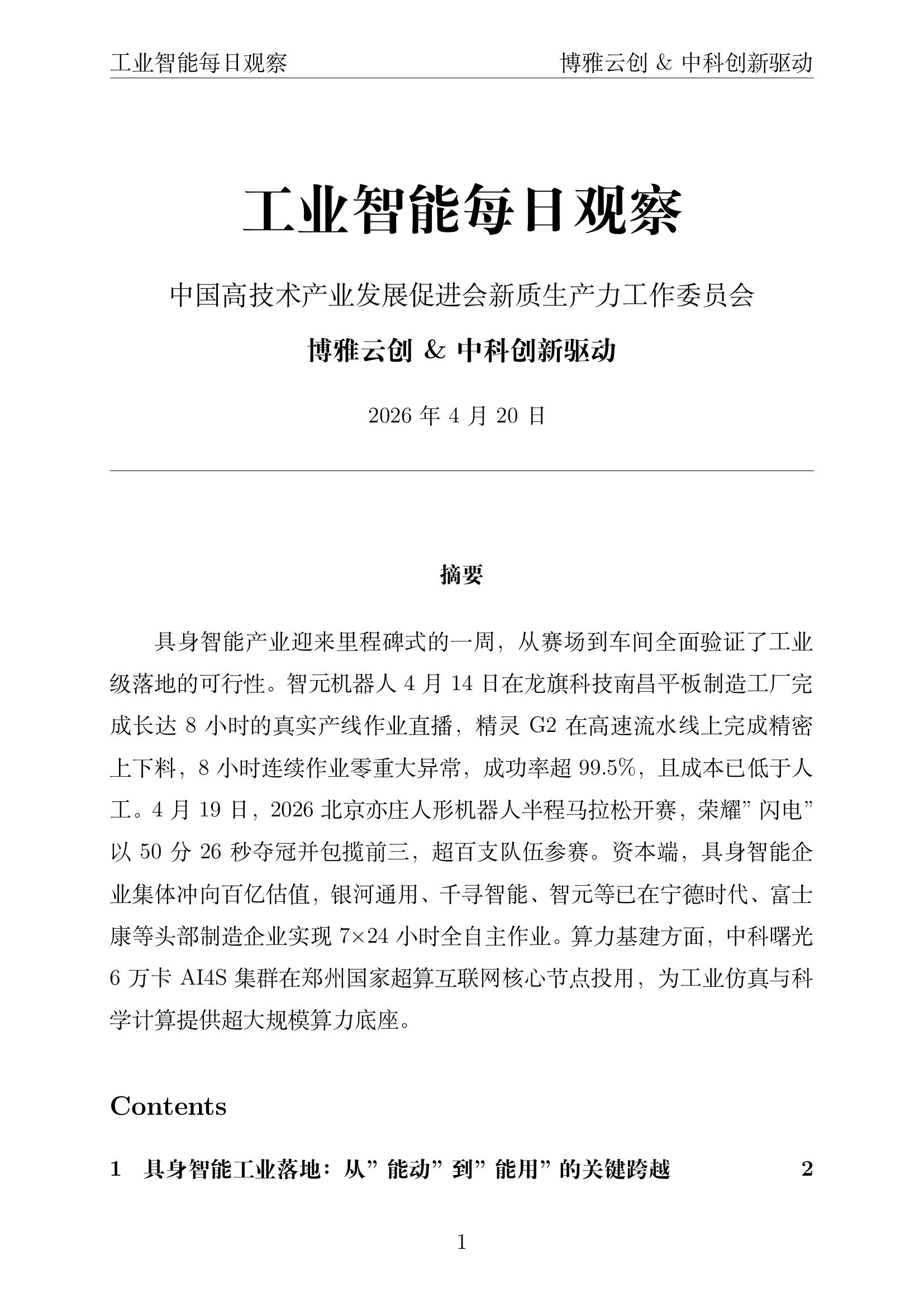 摘要:具身智能产业迎来里程碑式的一周。智元机器人在龙旗科技南昌工厂完成8小时真实产线直播,成功率超99.5%,成本已低于人工;北京亦庄人形机器人半马开赛,荣耀"闪电"50分26秒夺冠。具身智能企业集体冲向百亿估值,银河通用、千寻智能、智元等在宁德时代等头部制造企业实现7×24小时全自主作业。中科曙光6万卡AI4S集群在郑州投用,为工业仿真与科学计算提供超大规模算力底座。