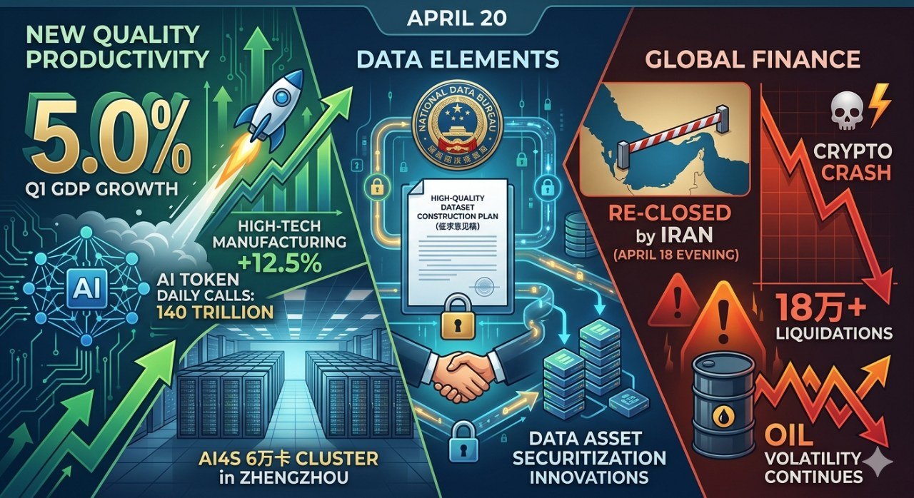 摘要:国家统计局公布一季度GDP增长5.0%,高技术制造业增加值同比增长12.5%,AI日均Token调用量突破140万亿,新质生产力"四化"特征鲜明。AI4S领域,中科曙光6万卡国产算力集群在郑州投用,多地抢滩科学智能赛道。数据要素方面,国家数据局发布《行业高质量数据集建设行动实施方案》征求意见稿,首提"词元交易"新模式。全球财经方面,霍尔木兹海峡戏剧性"开了又关",伊朗革命卫队恢复封锁并向过往船只开火,加密货币市场超18万人爆仓。