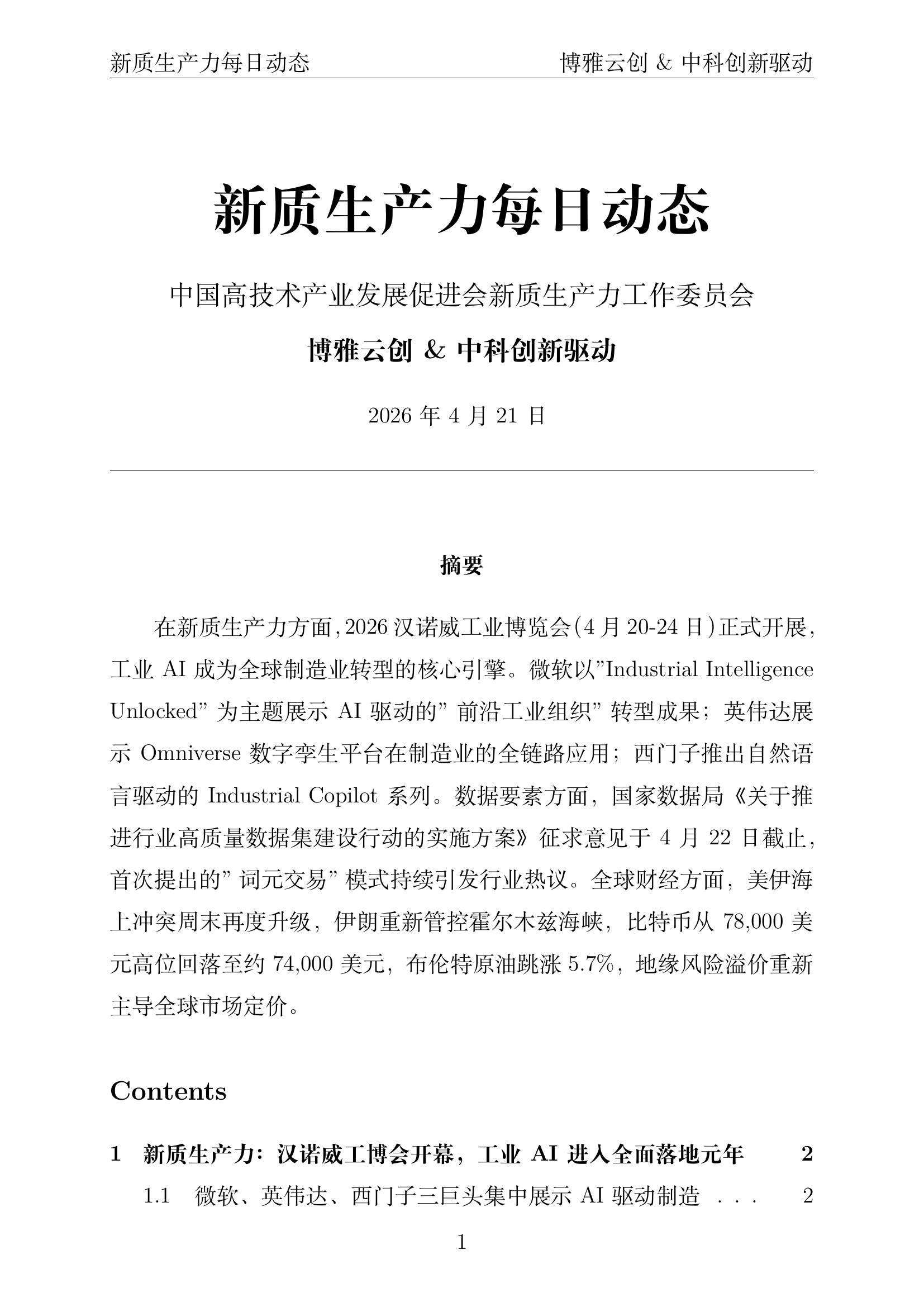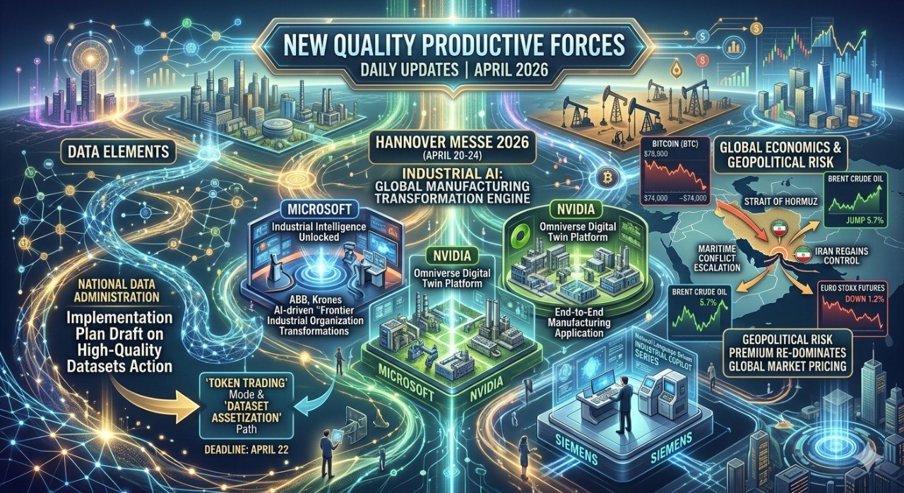 摘要:2026汉诺威工业博览会正式开展,工业AI成为全球制造业转型的核心引擎,微软、英伟达、西门子等巨头集中展示AI驱动制造全链路方案。国家数据局《行业高质量数据集建设行动实施方案》征求意见今日截止,"词元交易"等创新模式引发行业热议。全球财经方面,美伊海上冲突再度升级,伊朗重新管控霍尔木兹海峡,比特币从78000美元高位回落至74000美元附近,布伦特原油跳涨5.7%,地缘风险溢价重新主导市场定价。