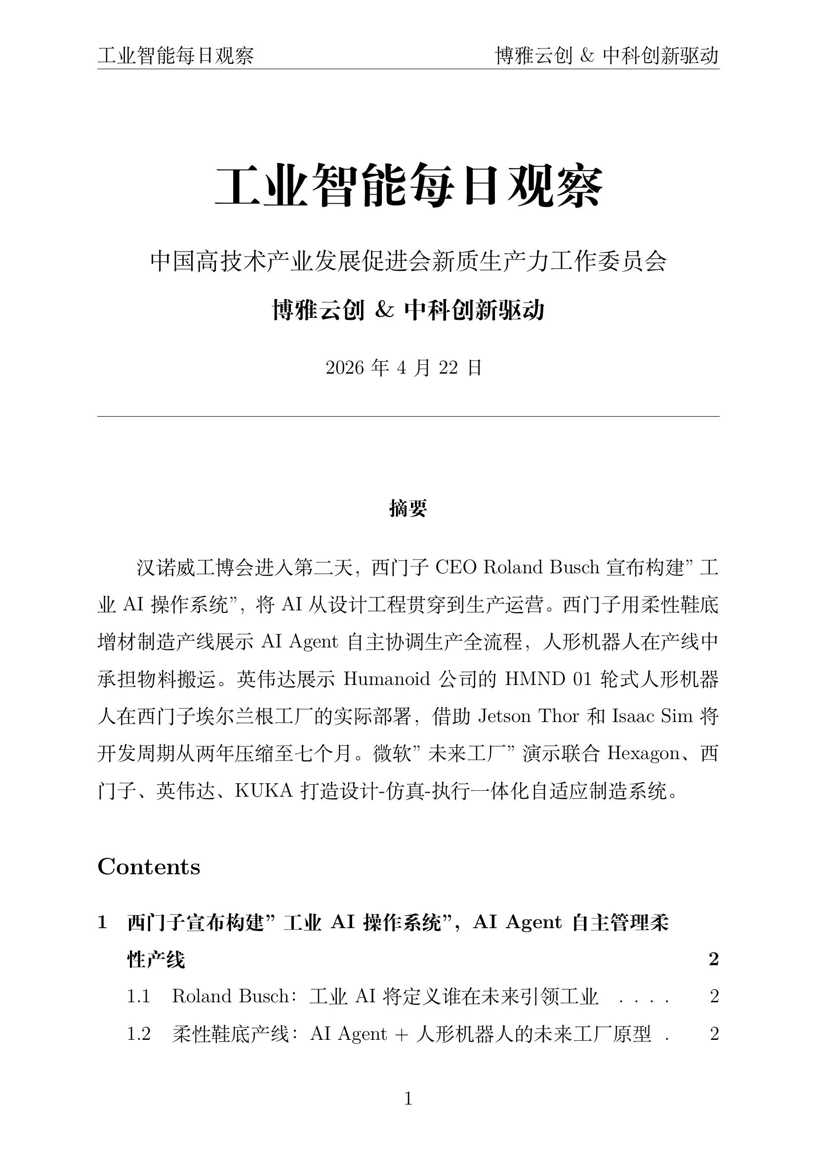 摘要:汉诺威工博会进入第二天,西门子CEO Roland Busch宣布构建"工业AI操作系统",将AI从设计工程贯穿到生产运营;西门子用柔性鞋底产线展示AI Agent自主协调生产全流程,人形机器人在产线中承担物料搬运。英伟达展示Humanoid HMND 01轮式人形机器人在西门子埃尔兰根工厂的实际部署,借助Jetson Thor和Isaac Sim将开发周期从两年压缩至七个月。微软"未来工厂"演示联合Hexagon、西门子、英伟达、KUKA打造设计-仿真-执行一体化自适应制造系统。