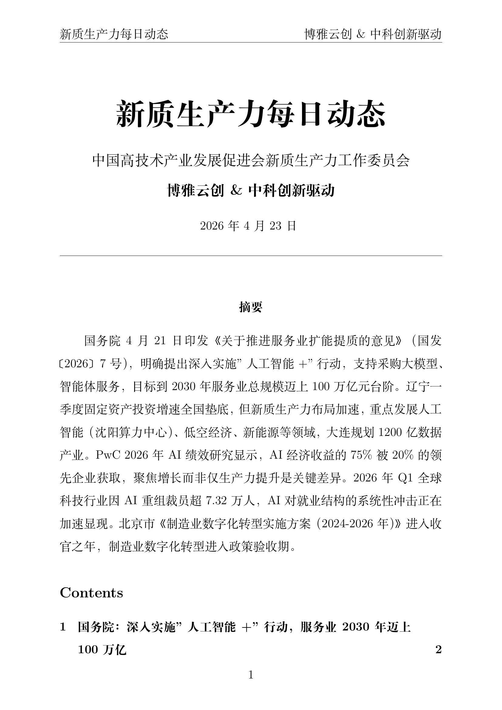 摘要:国务院4月21日印发《关于推进服务业扩能提质的意见》,明确深入实施"人工智能+"行动,支持采购大模型、智能体服务,目标2030年服务业总规模迈上100万亿元。辽宁新质生产力布局加速,沈阳算力中心建设、大连1200亿数据产业规划。PwC研究显示75%的AI经济回报被20%企业获取。2026年Q1全球科技裁员超7.32万人,AI对就业结构冲击加速。北京市制造业数字化转型方案进入收官之年。