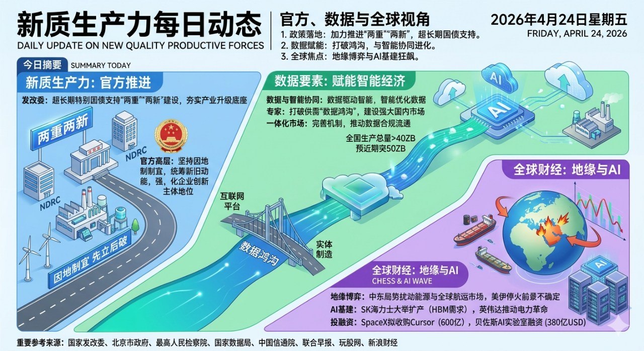 摘要:围绕“新质生产力”的政策部署与理论论述持续深化。国家发改委进一步明确以超长期特别国债为抓手,加力推进“两重”“两新”建设,将其作为改造提升传统产业、培育新质生产力的重要物质支撑;数据要素领域则持续围绕数据与人工智能的双向赋能、打破数据鸿沟以及建设全国一体化数据市场展开。全球财经层面,地缘博弈与AI产业狂飙共同主导市场波动。