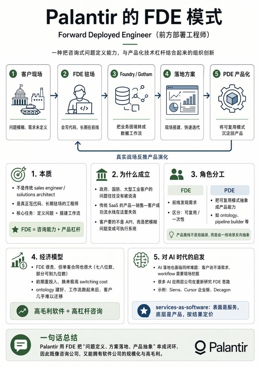今天,我们深度拆解这张流传甚广的 Palantir FDE 模式图,看看这家公司是如何通过组织创新,把"重人力咨询"转化成"高杠杆软件"的。