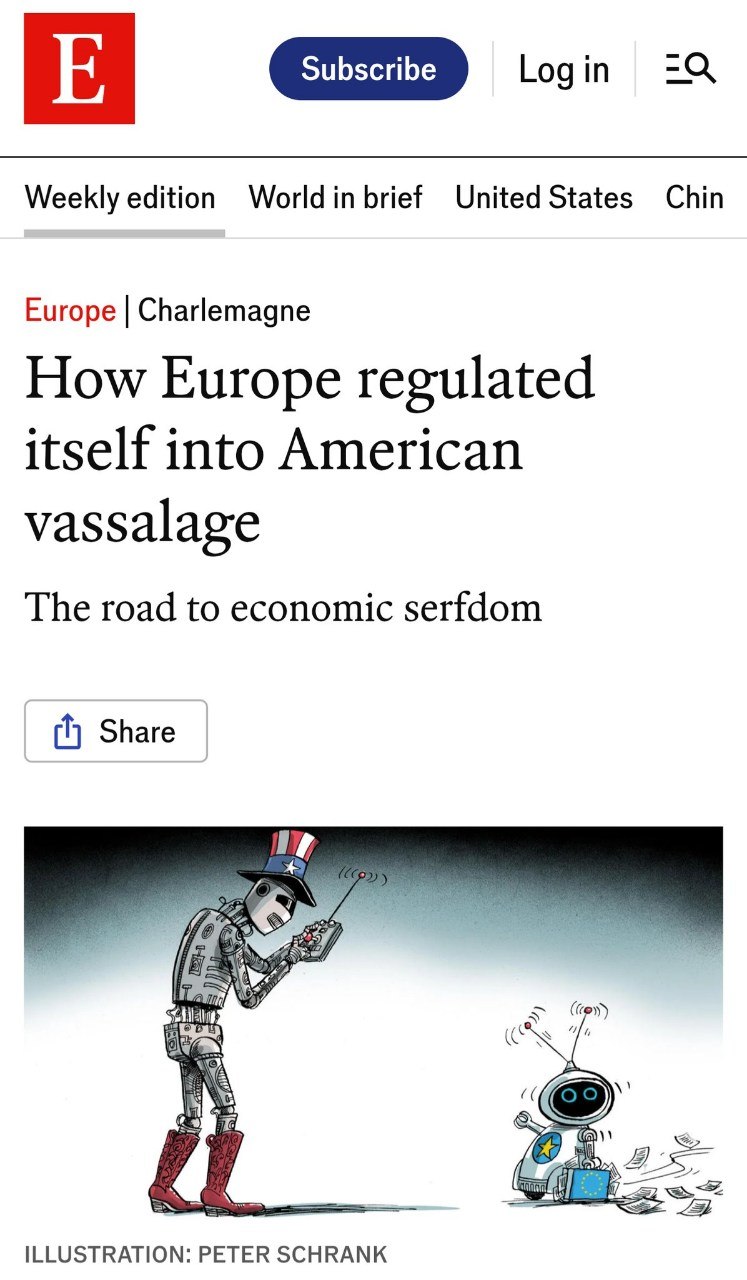 最近,《经济学人》Charlemagne 专栏的一篇文章在科技圈和政策圈引发讨论,题目很尖锐:How Europe regulated itself into American vassalage,副标题则是 The road to economic serfdom。翻成中文,大概就是:欧洲是如何通过监管,把自己变成美国科技附庸的?