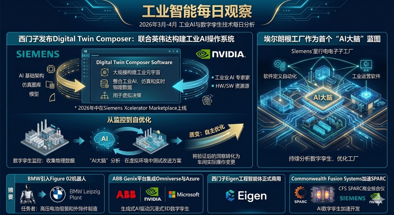 据英伟达新闻室公告,西门子与英伟达的合作目标是构建全AI驱动的自适应制造基地,以西门子位于德国埃尔朗根的电子工厂作为2026年首个蓝图。通过"AI大脑"——由软件定义自动化和工业运营软件驱动,结合英伟达Omniverse库和AI基础设施——工厂可以持续分析其数字孪生、在虚拟环境中测试改进方案,并将验证后的洞察转化为车间实际操作变更。这一模式代表了从"数字孪生监控"到"数字孪生自主优化"的质变。