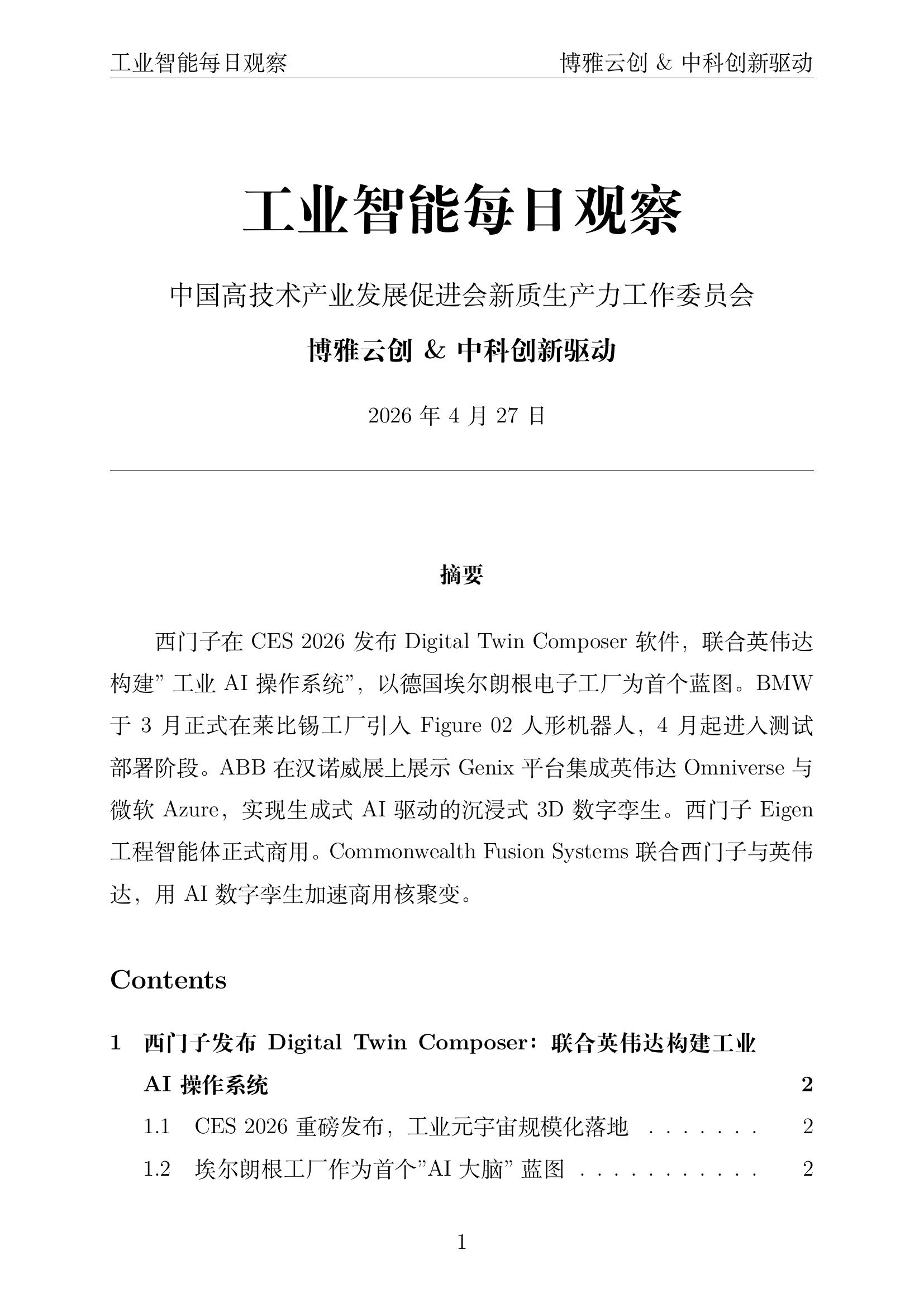 摘要:西门子在CES 2026发布Digital Twin Composer,联合英伟达构建工业AI操作系统,以埃尔朗根电子工厂为首个蓝图。BMW莱比锡工厂正式引入Figure 02人形机器人,4月起进入测试部署阶段。ABB Genix集成英伟达Omniverse与微软Azure,实现生成式AI驱动的3D数字孪生。西门子Eigen工程智能体正式商用,可自主生成PLC代码。Commonwealth Fusion Systems联合西门子与英伟达,用AI数字孪生加速商用核聚变。