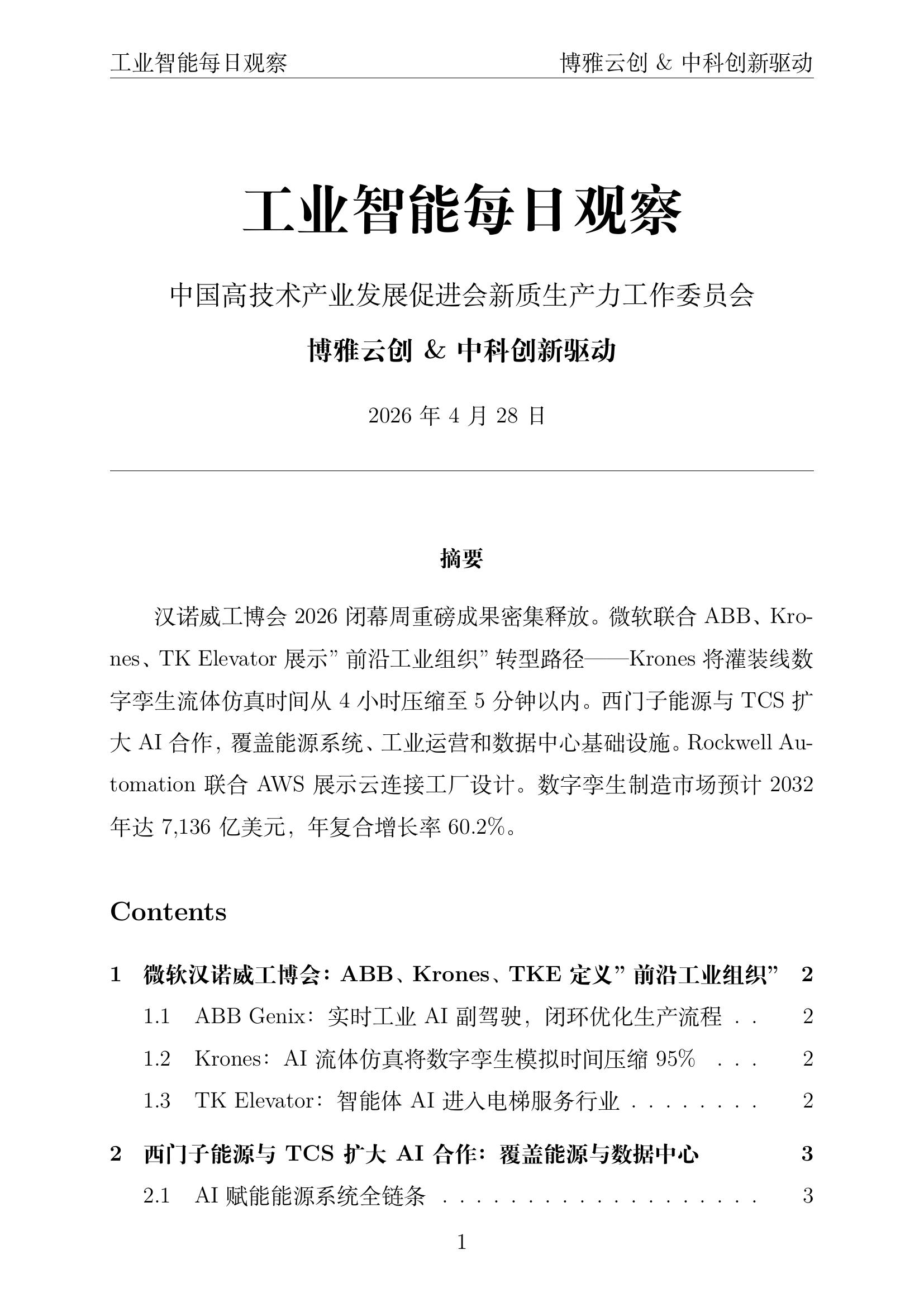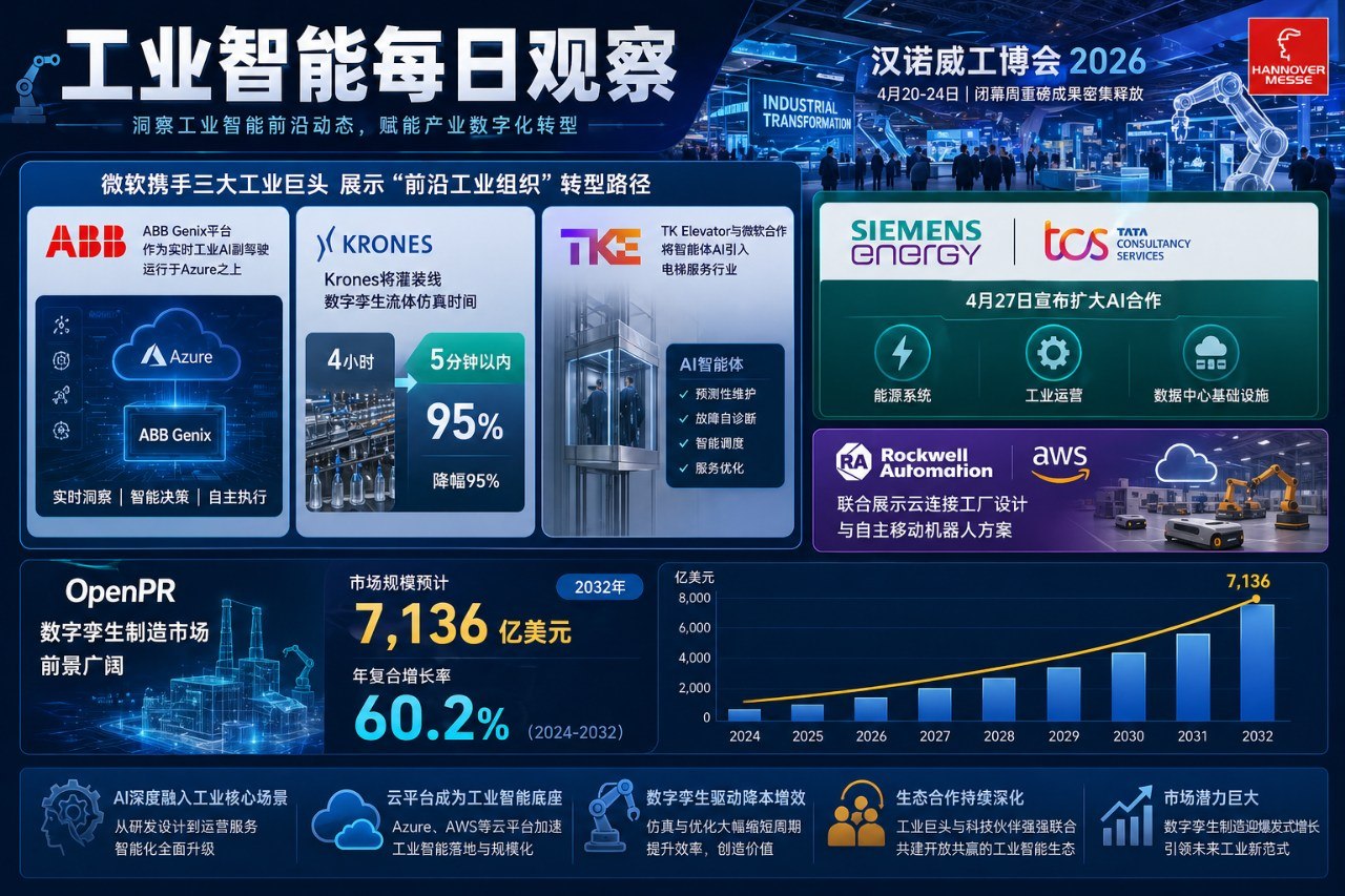 摘要:汉诺威工博会2026闭幕周重磅成果密集释放。微软联合ABB、Krones、TK Elevator展示"前沿工业组织"转型路径——Krones将灌装线数字孪生流体仿真时间从4小时压缩至5分钟以内。西门子能源与TCS扩大AI合作,覆盖能源系统、工业运营和数据中心基础设施。Rockwell Automation联合AWS展示云连接工厂设计。数字孪生制造市场预计2032年达7136亿美元,年复合增长率60.2%。
