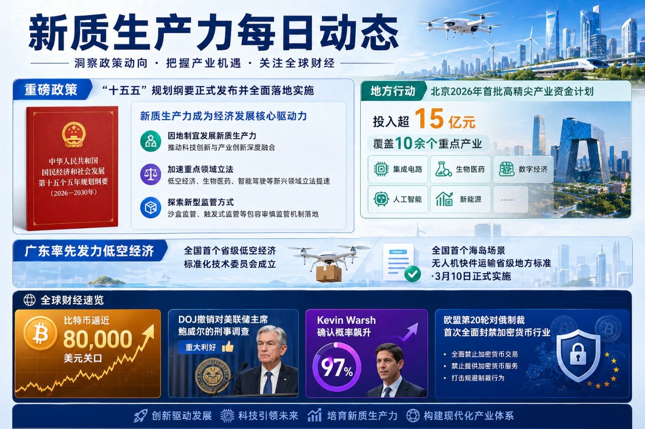摘要:十五五规划纲要全面落地实施,新质生产力被明确为经济发展核心驱动力。规划提出因地制宜发展新质生产力,加速低空经济、生物医药、智能驾驶等新兴领域立法。北京2026年首批高精尖产业资金计划投入超15亿元,覆盖集成电路、生物医药等10余个重点产业。广东率先组建全国首个省级低空经济标准化技术委员会。全球财经方面,比特币逼近80,000美元,DOJ撤销对美联储主席鲍威尔的刑事调查,Kevin Warsh确认概率飙升至97%。