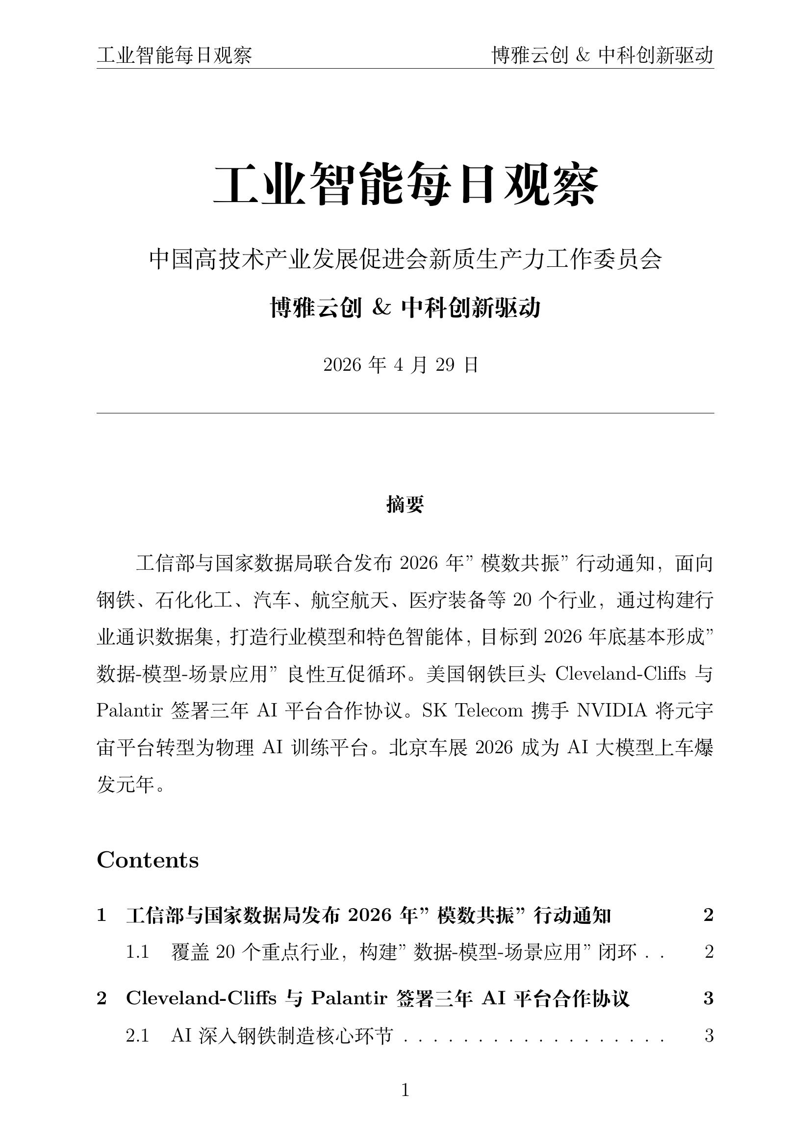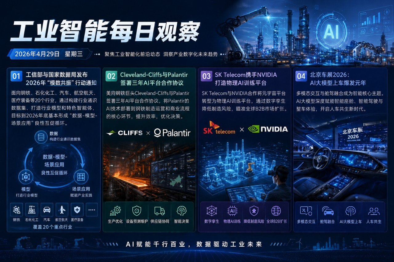 摘要:工信部与国家数据局联合发布2026年"模数共振"行动通知,面向钢铁、石化化工、汽车、航空航天、医疗装备等20个行业,通过构建行业通识数据集,打造行业模型和特色智能体,目标到2026年底基本形成"数据-模型-场景应用"良性互促循环。美国钢铁巨头Cleveland-Cliffs与Palantir签署三年AI平台合作协议,将AI技术部署到钢铁制造运营和商业流程的核心环节。SK Telecom携手NVIDIA将元宇宙平台转型为物理AI训练平台,通过数字孪生降低制造风险。北京车展2026成为AI大模型上车爆发元年。