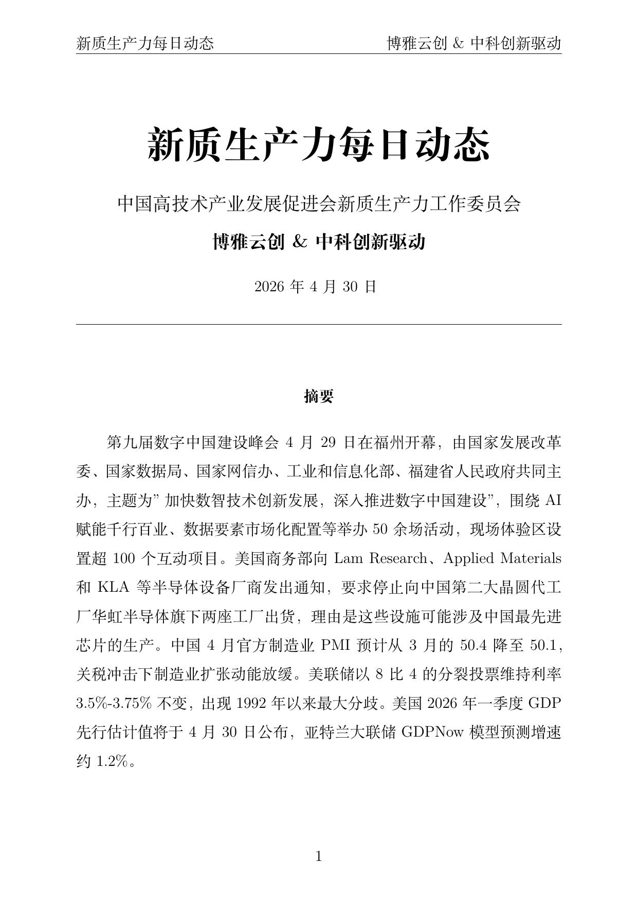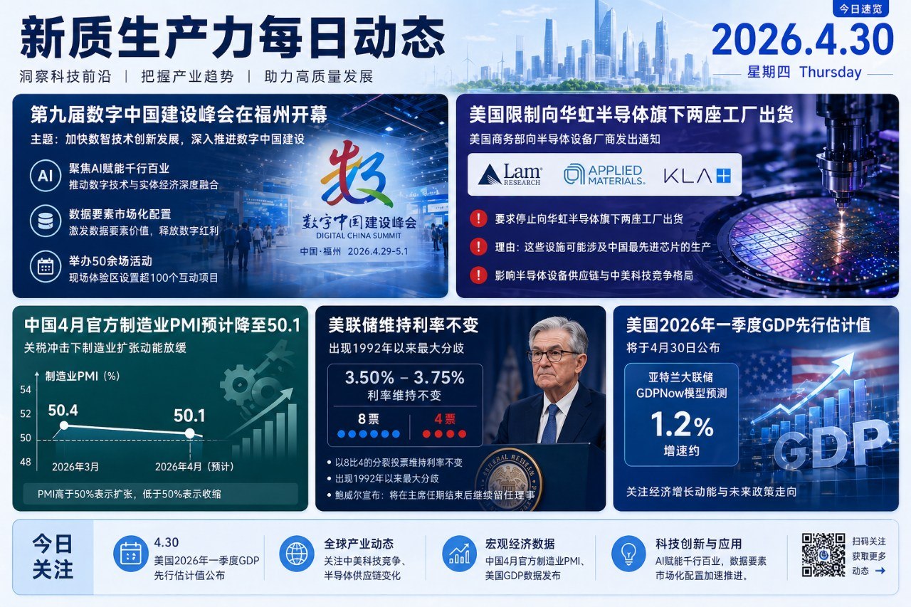 摘要:第九届数字中国建设峰会4月29日在福州开幕,主题为"加快数智技术创新发展,深入推进数字中国建设",聚焦数智融合、创新主体、场景驱动三大方向。美国商务部向Lam Research、Applied Materials和KLA等半导体设备厂商发出通知,要求停止向中国第二大晶圆代工厂华虹半导体旗下两座工厂出货。中国4月官方制造业PMI预计从3月的50.4降至50.1,关税冲击下制造业扩张动能放缓。美联储以8比4分裂投票维持利率3.5%-3.75%不变,鲍威尔宣布将继续留任理事。美国一季度GDP先行估计值今日公布。
