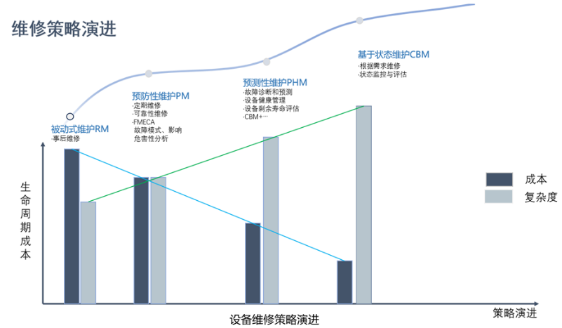 上世纪七十年代以前,设备管理和运维以事后维修为主,之后逐步演变为预防性维修。进入九十年代后期,激烈的市场竞争促使企业开始采用主动维修方式,例如飞机发动机领域最早尝试应用预测性维护手段。工业4.0时代的来临,使得制造业也逐步进入万物互联时代,尤其是近几年来以工业互联网为基础的工业智能技术和边缘计算技术的不断演进和日趋成熟,以往用于高端装备的预测性维护等智能运维手段具备了大范围应用的经济性前提,被认为是工业互联网最有落地潜力和高附加价值的“杀手级”应用。