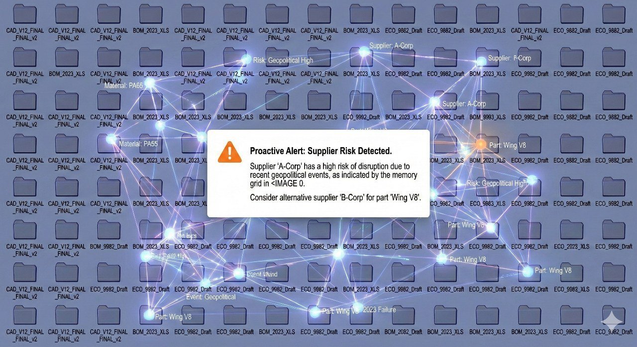 随着领先厂商开始深度集成知识图谱(Knowledge Graph)技术,PLM 正在从一个被动的数据仓库,进化为一个拥有主动意识的"产品记忆网格"(Product Memory Grid)。它不再等着你提问,而是开始像一位经验丰富的老工程师那样,主动拍拍你的肩膀说:“嘿,伙计,这地方以前出过事,你确定要这么做吗?”