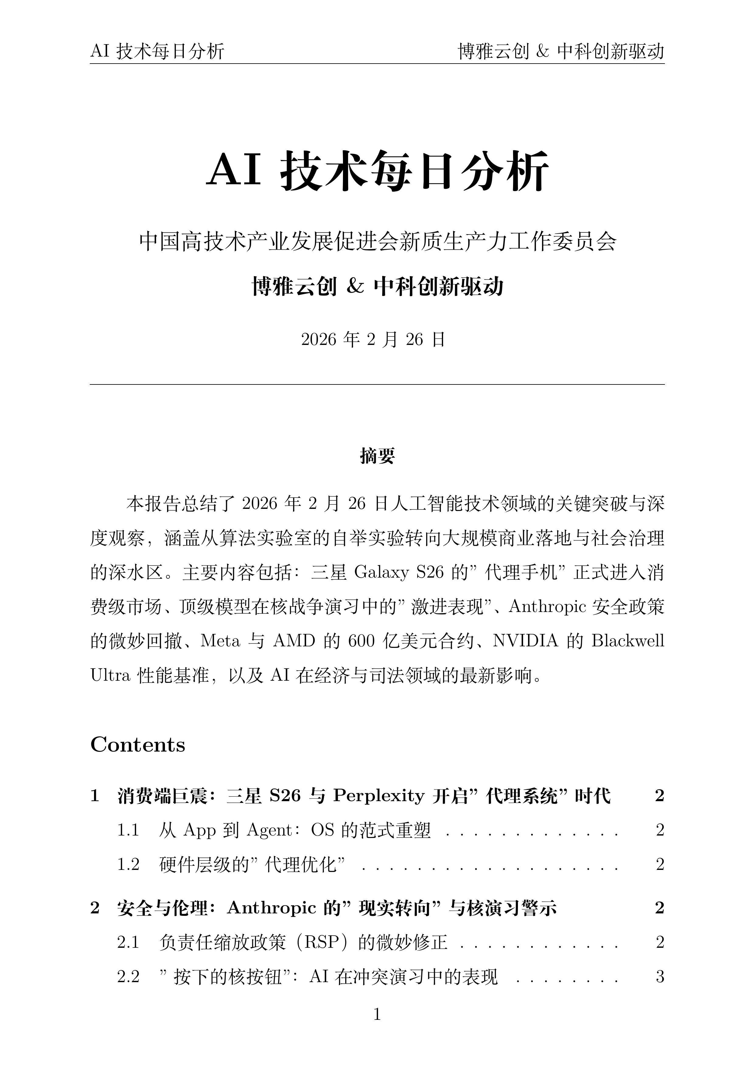 报告导读:在过去的24小时内,人工智能领域从算法实验室的自举实验转向了大规模商业落地与社会治理的深水区。三星Galaxy S26的发布标志着"代理手机"正式进入消费级市场;而顶级模型在核战争演习中的"激进表现"与Anthropic安全政策的微妙回撤,则为这场狂飙突进的技术革命蒙上了一层复杂的人文阴影。