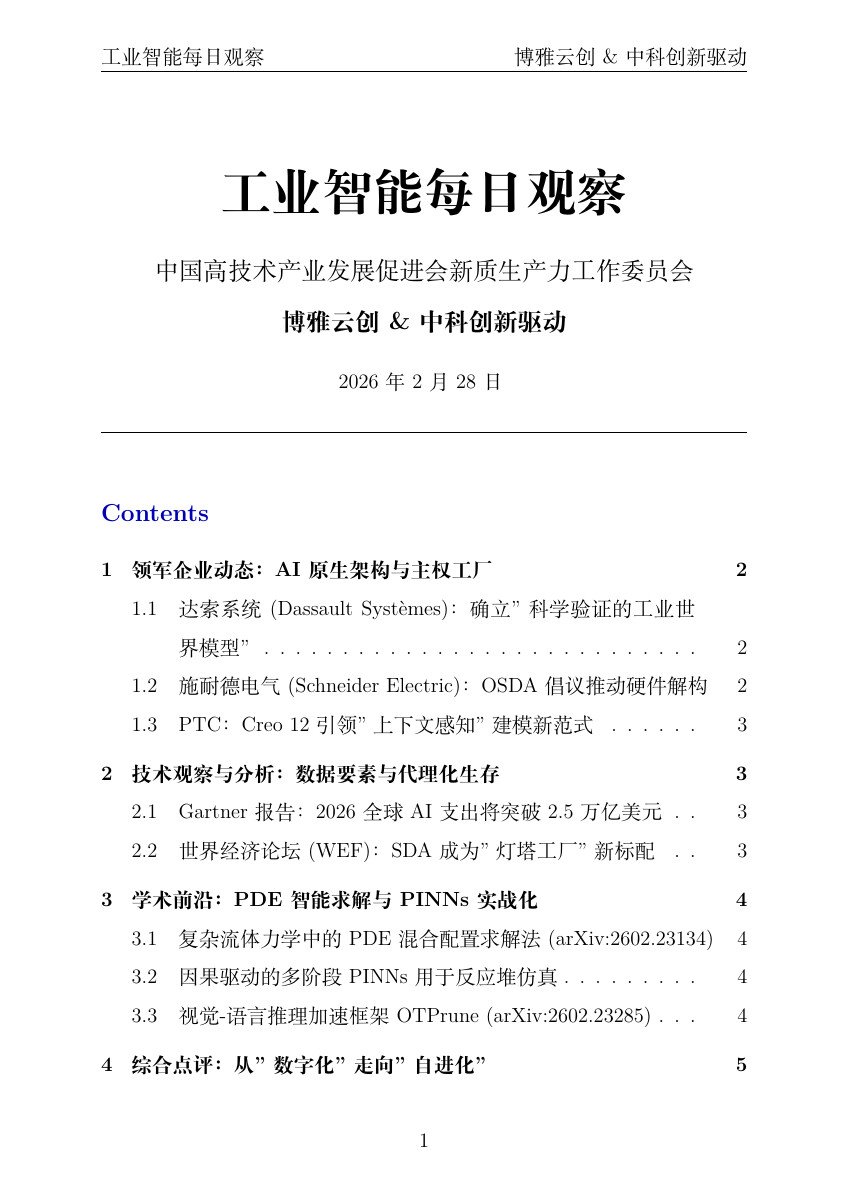 在2026年2月的最后24小时内,全球工业智能化领域正在经历一场从“数字化转型”到“自治化重构”的范式迁徙。如果说2025年是工业大模型的探索年,那么今日(2026年2月28日)的一系列动态则标志着“软件定义自动化 (SDA)”与“代理式AI (Agentic AI)”正式接管工厂底座。物理规律与数据逻辑正在通过“科学验证的工业世界模型 (Scientific-validated Industry World Models)”实现前所未有的合流。以下是为您整理的过去24小时行业最前沿观察。