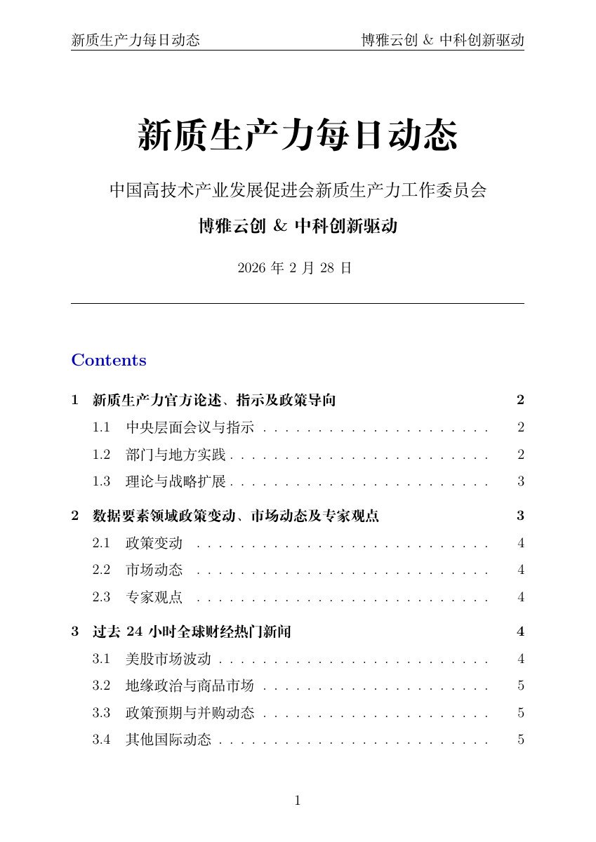 过去24小时内,中国官方渠道和主流媒体围绕新质生产力发布了多条重要论述和指示,主要强调因地制宜发展、融入“十五五”规划、传统产业智能化改造,以及科技创新驱动。聚焦官方指导思想和地方落实动态。数据要素领域出现政策意见发布和市场培育动态,强调价值释放和机构培育。全球财经方面,市场关注AI企业业绩、通胀数据、地缘政治紧张、美联储政策预期,以及并购动态。