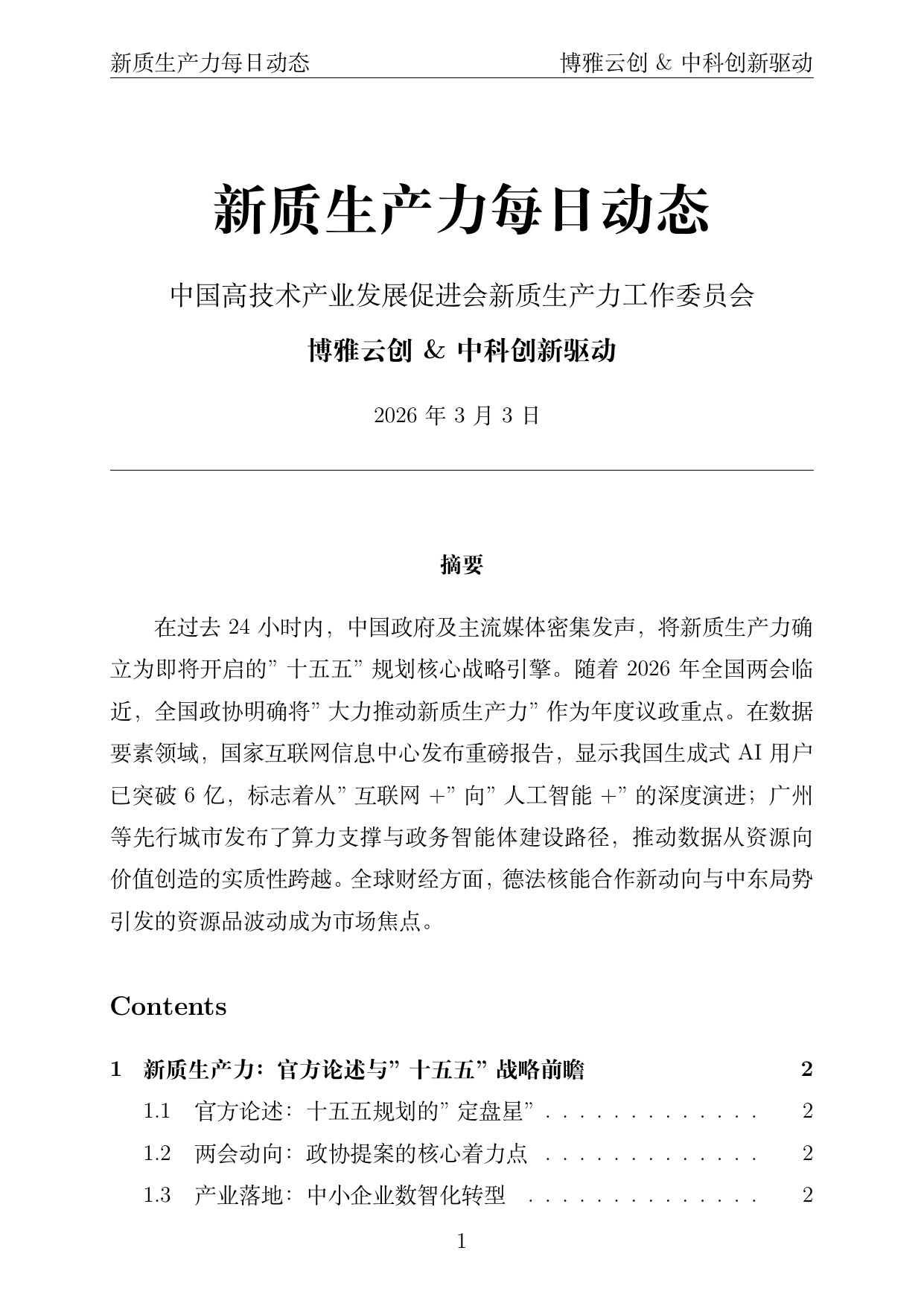 2026年3月3日的动态显示,新质生产力已从"政策概念"全面进入"落地执行"阶段。随着全国两会的召开,预计将有更多具体的产业支持政策和数据要素市场化改革措施出台。生成式AI用户突破6亿标志着中国正式进入"人工智能+"时代,为数字经济的发展注入了强劲动力。