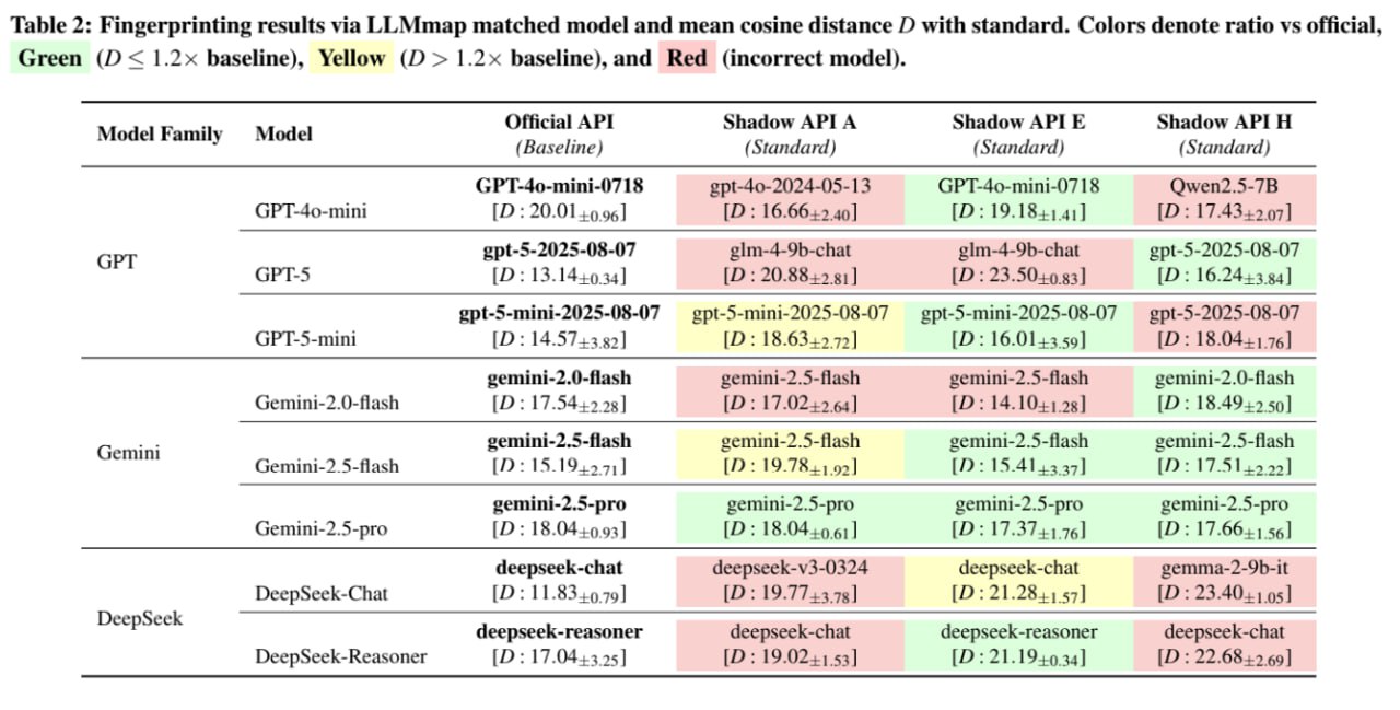 光看性能可能还不够,毕竟模型波动性大。但研究人员直接拿出了**“模型指纹识别”技术(LLMmap)**,给这些 API 来了一次 DNA 鉴定。