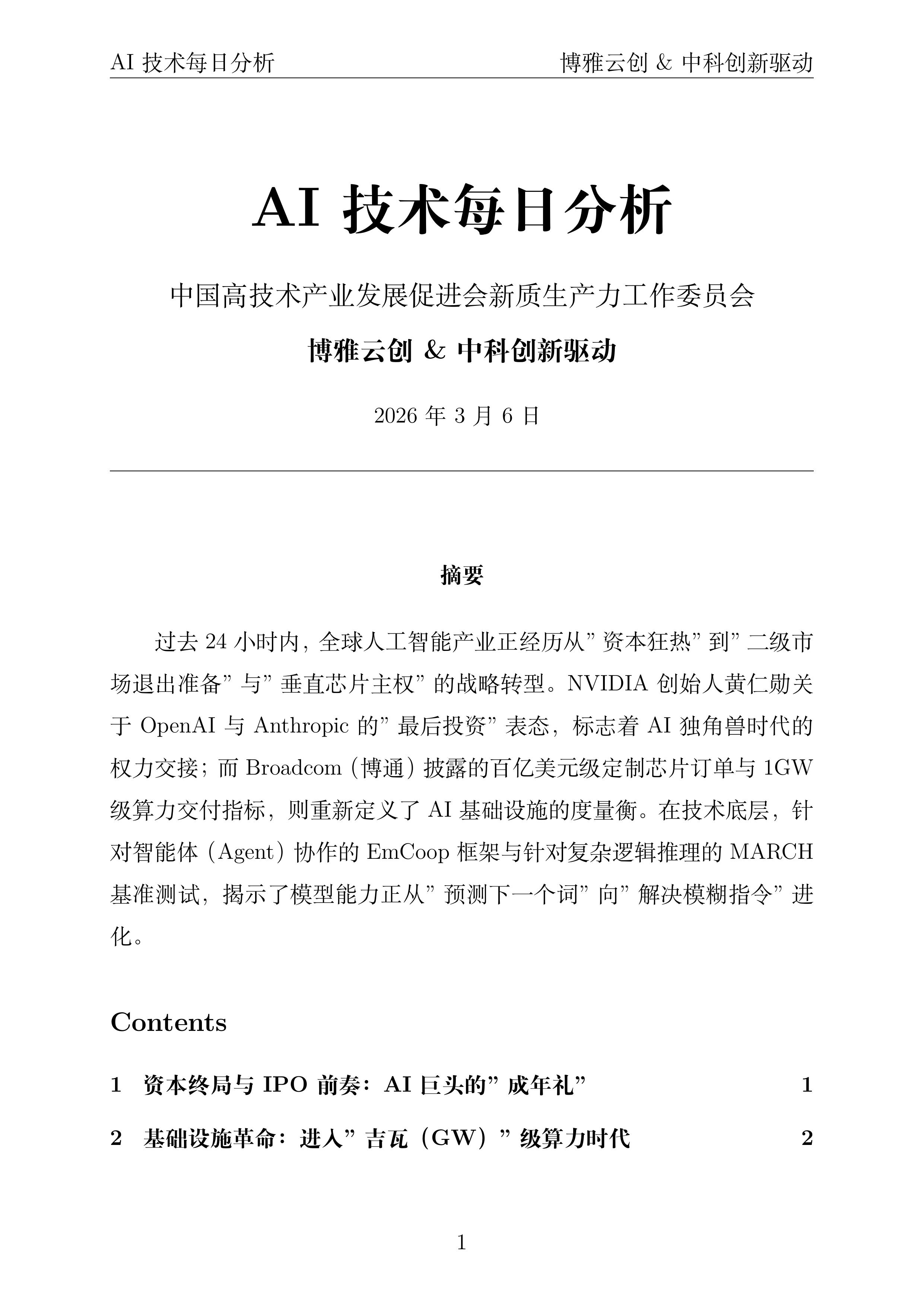过去24小时内,全球人工智能产业正经历从"资本狂热"到"二级市场退出准备"与"垂直芯片主权"的战略转型。NVIDIA 创始人黄仁勋关于 OpenAI 与 Anthropic 的"最后投资"表态,标志着 AI 独角兽时代的权力交接;而 Broadcom(博通)披露的百亿美元级定制芯片订单与 1GW 级算力交付指标,则重新定义了 AI 基础设施的度量衡。在技术底层,针对智能体(Agent)协作的 EmCoop 框架与针对复杂逻辑推理的 MARCH 基准测试,揭示了模型能力正从"预测下一个词"向"解决模糊指令"进化。