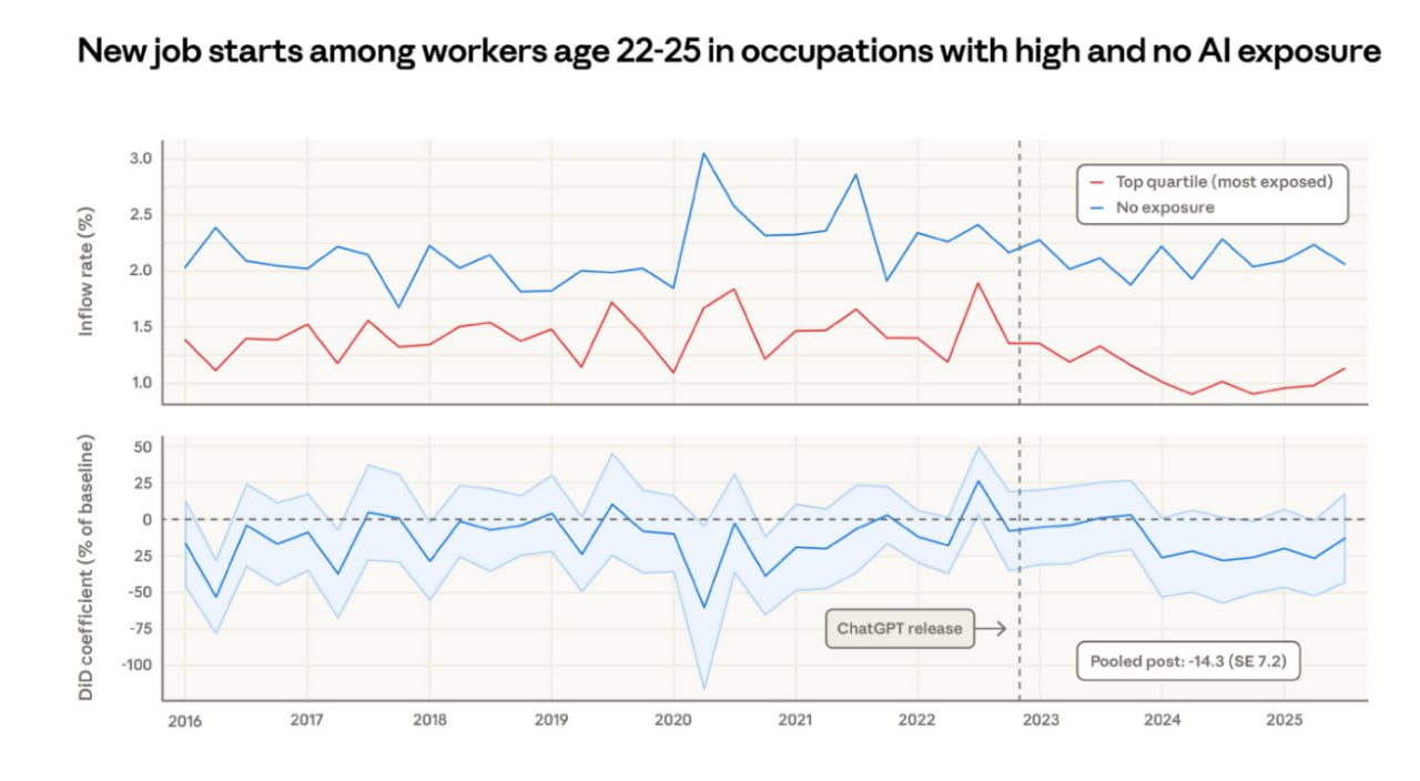 报告引用了Brynjolfsson et al. (2025) 的发现,即在暴露度高的职业中,22至25岁工人的就业率下降了6%到16%,主要归因于招聘放缓。Anthropic的报告进一步通过追踪年轻工人开始新工作的月度比率(Inflow rate)来验证这一趋势。