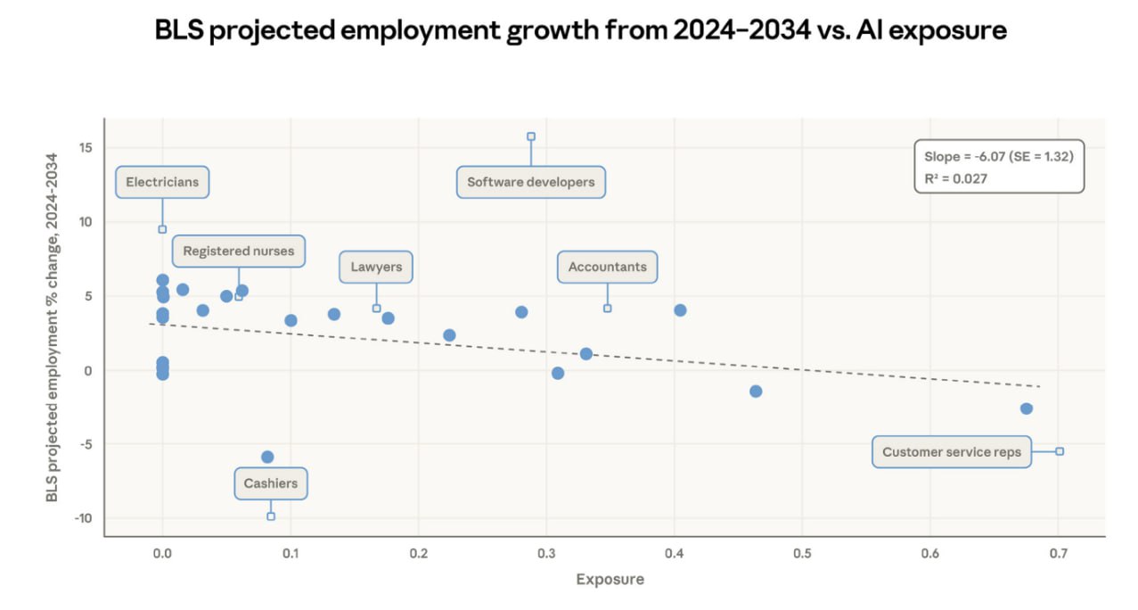 - 暴露度与工作增长预测: 观察到的暴露度较高的职业,根据美国劳工统计局(BLS)的预测,到2034年的增长预计会较慢。
