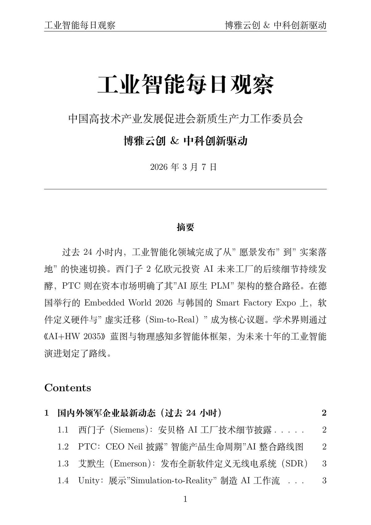 过去24小时内,工业智能化领域完成了从"愿景发布"到"实案落地"的快速切换。西门子2亿欧元投资AI未来工厂的后续细节持续发酵,PTC则在资本市场明确了其"AI原生PLM"架构的整合路径。在德国举行的Embedded World 2026与韩国的Smart Factory Expo上,软件定义硬件与"虚实迁移(Sim-to-Real)"成为核心议题。学术界则通过《AI+HW 2035》蓝图与物理感知多智能体框架,为未来十年的工业智能演进划定了路线。