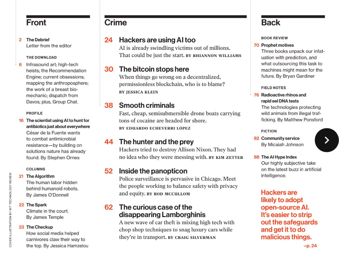 本期杂志的深度报道不仅聚焦于AI如何武装了黑客,更深入探讨了我们日常生活中无处不在的数字基础设施,正如何成为犯罪和执法的新战场。从芝加哥的"全景监狱"到豪华跑车的失踪,再到去中心化金融(DeFi)的道德困境,技术正在以前所未有的速度,模糊着安全、隐私与责任的界限。