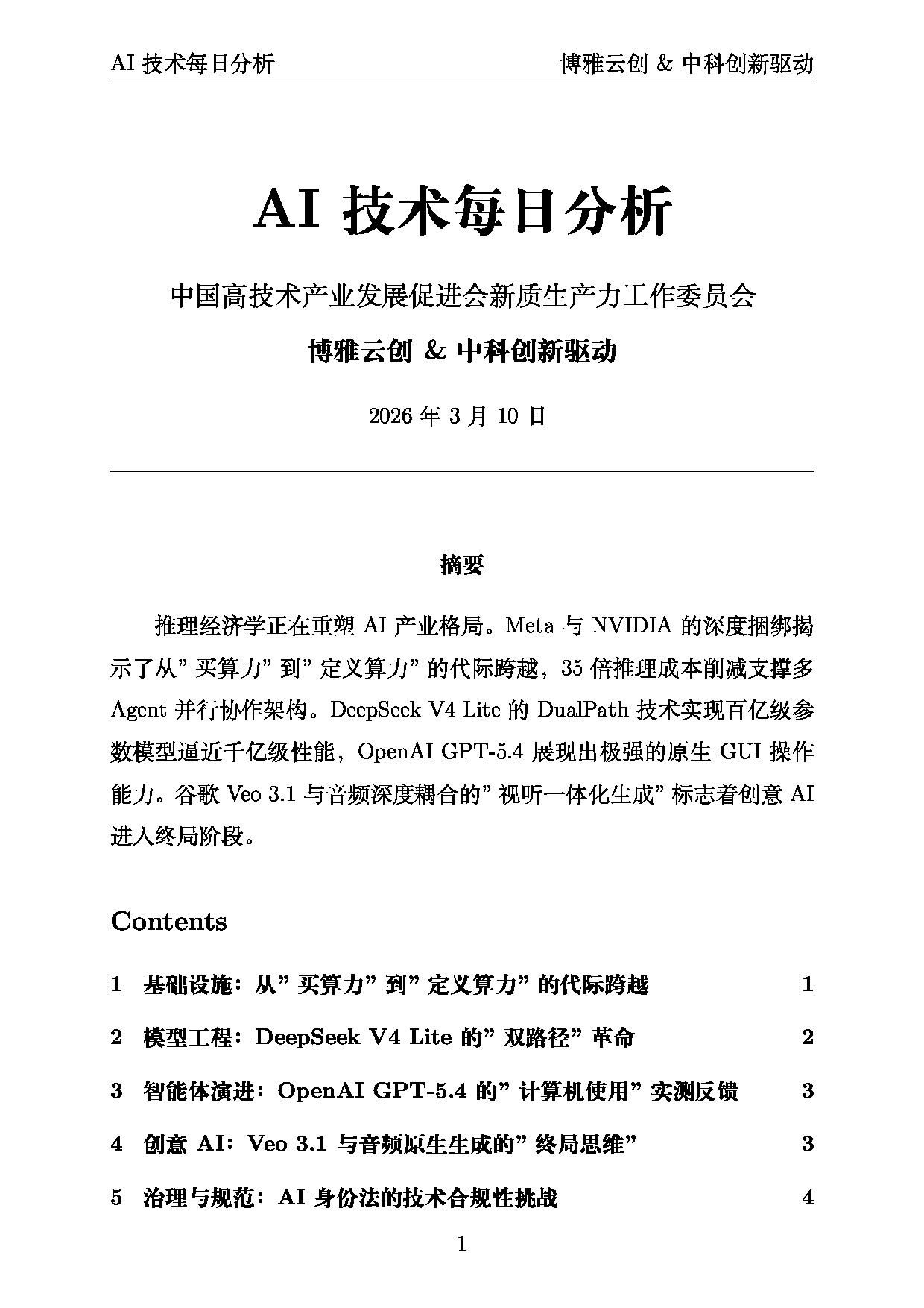 推理经济学正在重塑AI产业格局。Meta与NVIDIA的深度捆绑揭示了从"买算力"到"定义算力"的代际跨越,35倍推理成本削减支撑多Agent并行协作架构。DeepSeek V4 Lite的DualPath技术实现百亿级参数模型逼近千亿级性能,OpenAI GPT-5.4展现出极强的原生GUI操作能力。谷歌Veo 3.1与音频深度耦合的"视听一体化生成"标志着创意AI进入终局阶段。