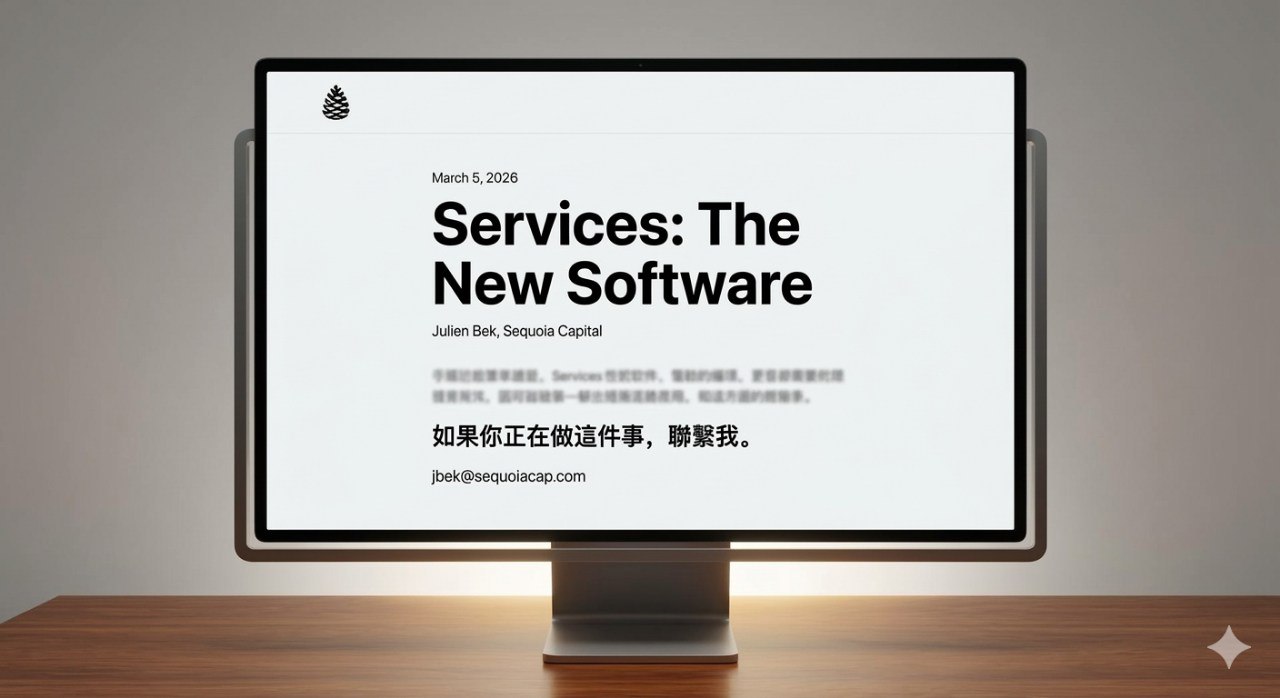 2026 年 3 月 5 日,红杉资本(Sequoia Capital)合伙人 Julien Bek 发布了一篇名为《Services: The New Software》的短文。这篇文章迅速在硅谷和全球创业圈引发了地震。文章篇幅极短,甚至没有华丽的辞藻,只有透彻骨髓的商业逻辑。最令人震惊的是,Bek 在文章末尾打破了顶级 VC 的高冷惯例,直接贴出了自己的 Email 邮箱:“如果你正在做这件事,联系我。”