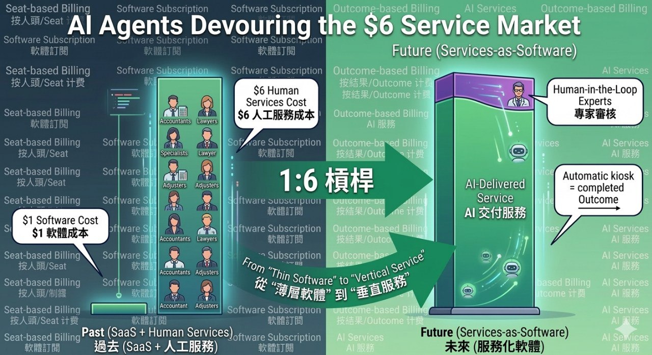 这种模式的转换,意味着初创公司正在试图吞掉那"6 美元"的服务市场,而不仅仅是争夺那"1 美元"的软件预算。