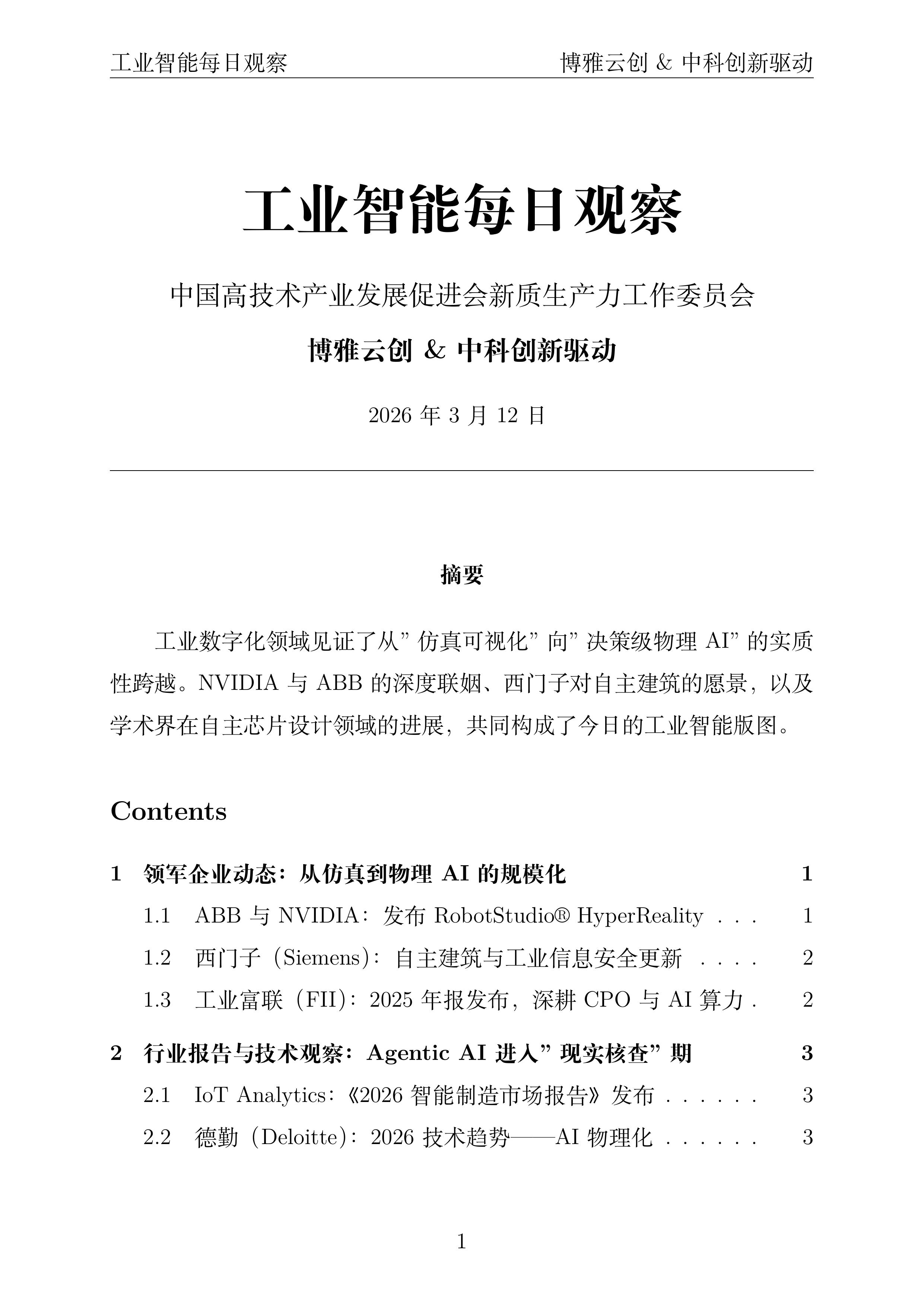 工业数字化领域见证了从"仿真可视化"向"决策级物理AI"的实质性跨越。NVIDIA与ABB的深度联姻、西门子对自主建筑的愿景,以及学术界在自主芯片设计领域的进展,共同构成了今日的工业智能版图。