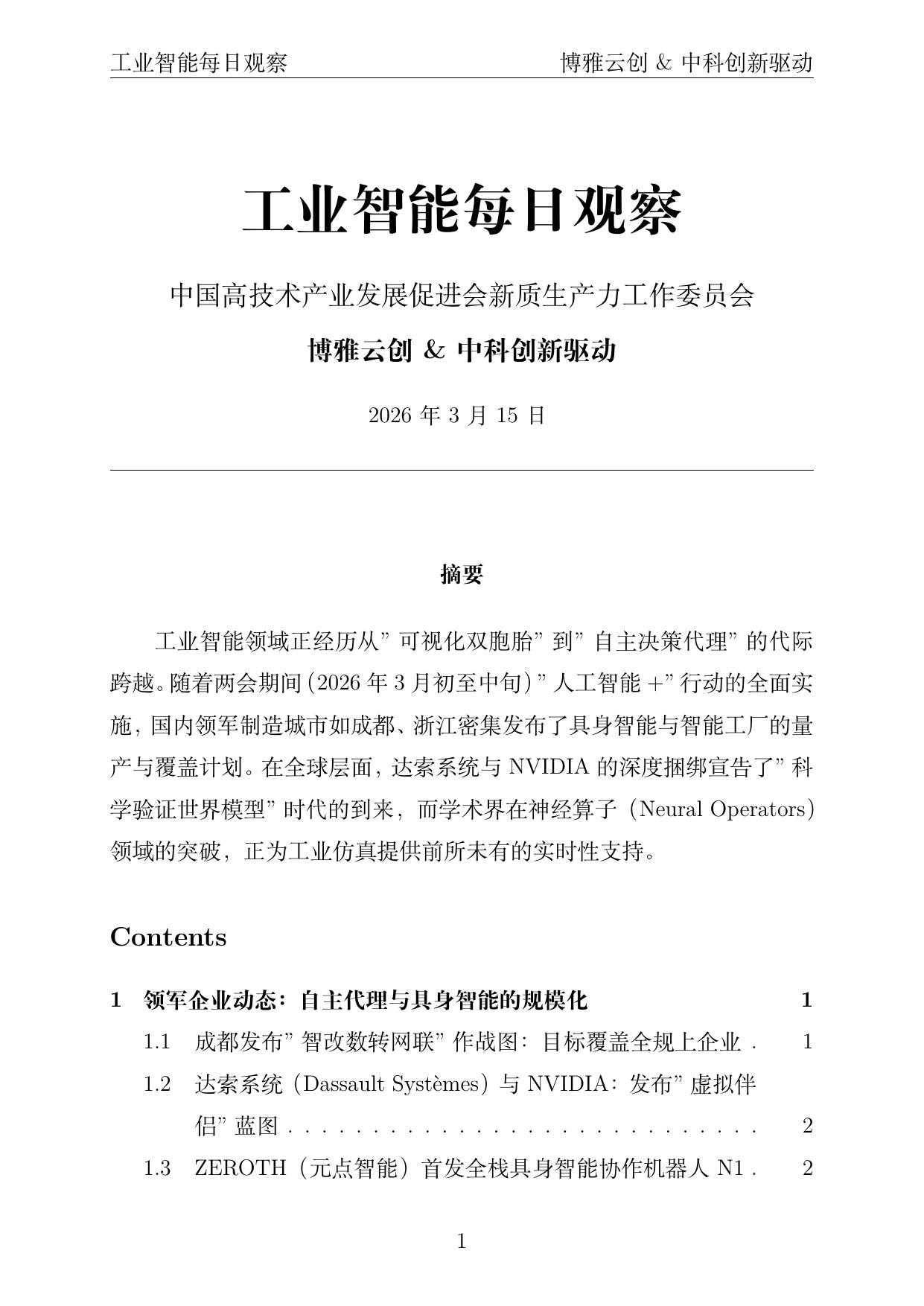 工业智能领域正经历从"可视化双胞胎"到"自主决策代理"的代际跨越。随着两会期间(2026年3月初至中旬)"人工智能+"行动的全面实施,国内领军制造城市如成都、浙江密集发布了具身智能与智能工厂的量产与覆盖计划。在全球层面,达索系统与 NVIDIA 的深度捆绑宣告了"科学验证世界模型"时代的到来,而学术界在神经算子(Neural Operators)领域的突破,正为工业仿真提供前所未有的实时性支持。