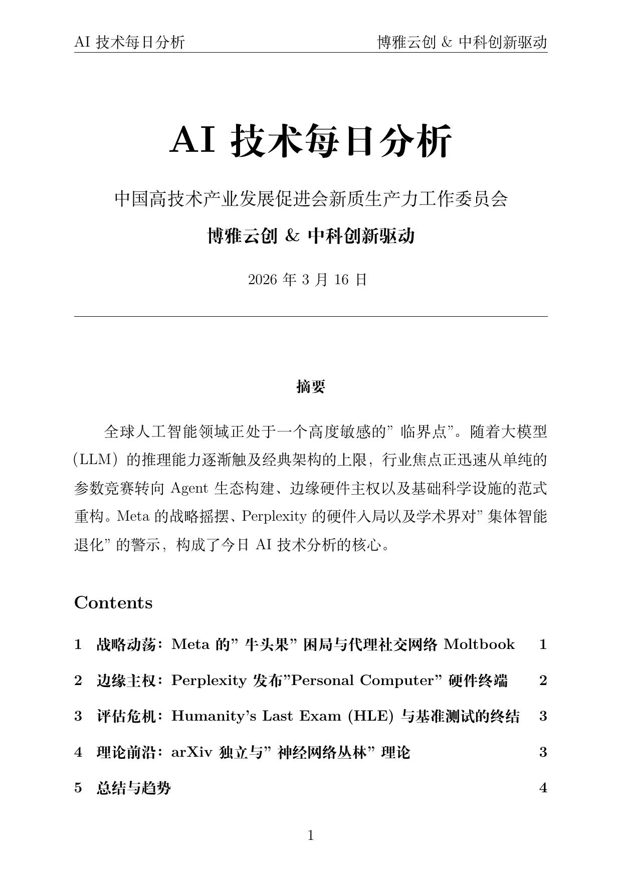 2026年3月16日的这24小时,是 AI 从"单体智慧"向"社会化生存"转型的缩影。Meta 的犹豫代表了旧有巨头在庞大成本面前的阵痛;Perplexity 的硬件代表了用户对数据主权的重申;而 HLE 考试则像一面镜子,照出了当前 AI 距离真正科学发现的漫长路途。