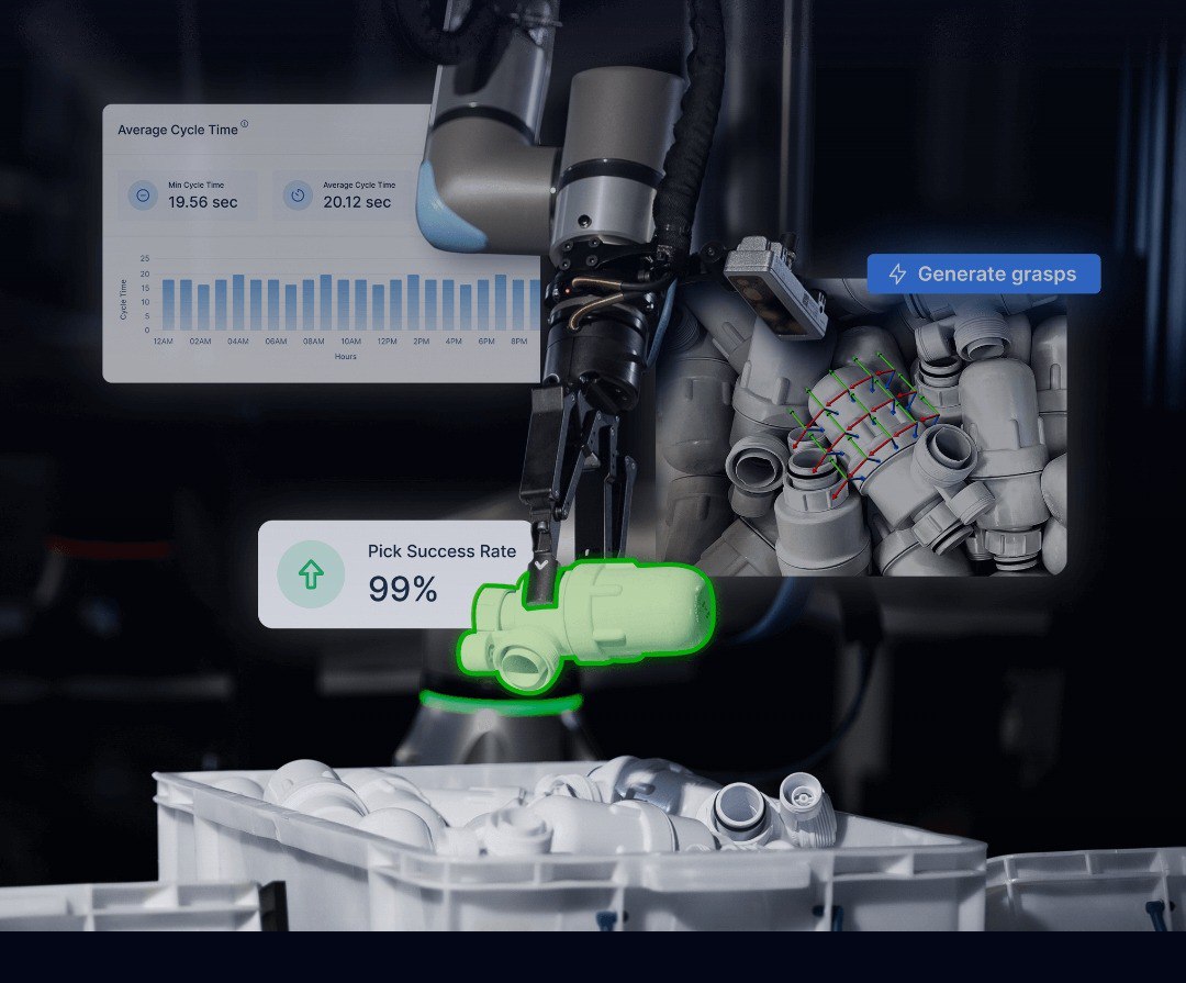 它专治"乱堆物料"痛点:零件随机朝向、相互遮挡、箱深达24英寸(约60cm)、材质从不透明到透明、环境光从强光到黑暗,全都能稳稳处理。传统视觉系统需要海量标注数据和反复训练,Rapid Operator AI采用零样本(zero-shot)机制,直接用CAD文件上新零件,几分钟搞定。