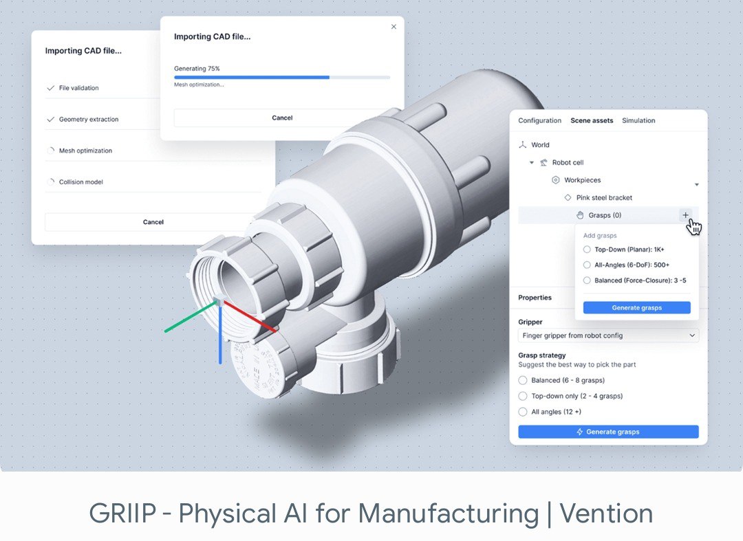 Rapid Operator AI的灵魂是GRIIP™(Generalized Robotic Industrial Intelligence Pipeline)——Vention自研的物理AI流水线,融合四大利器: