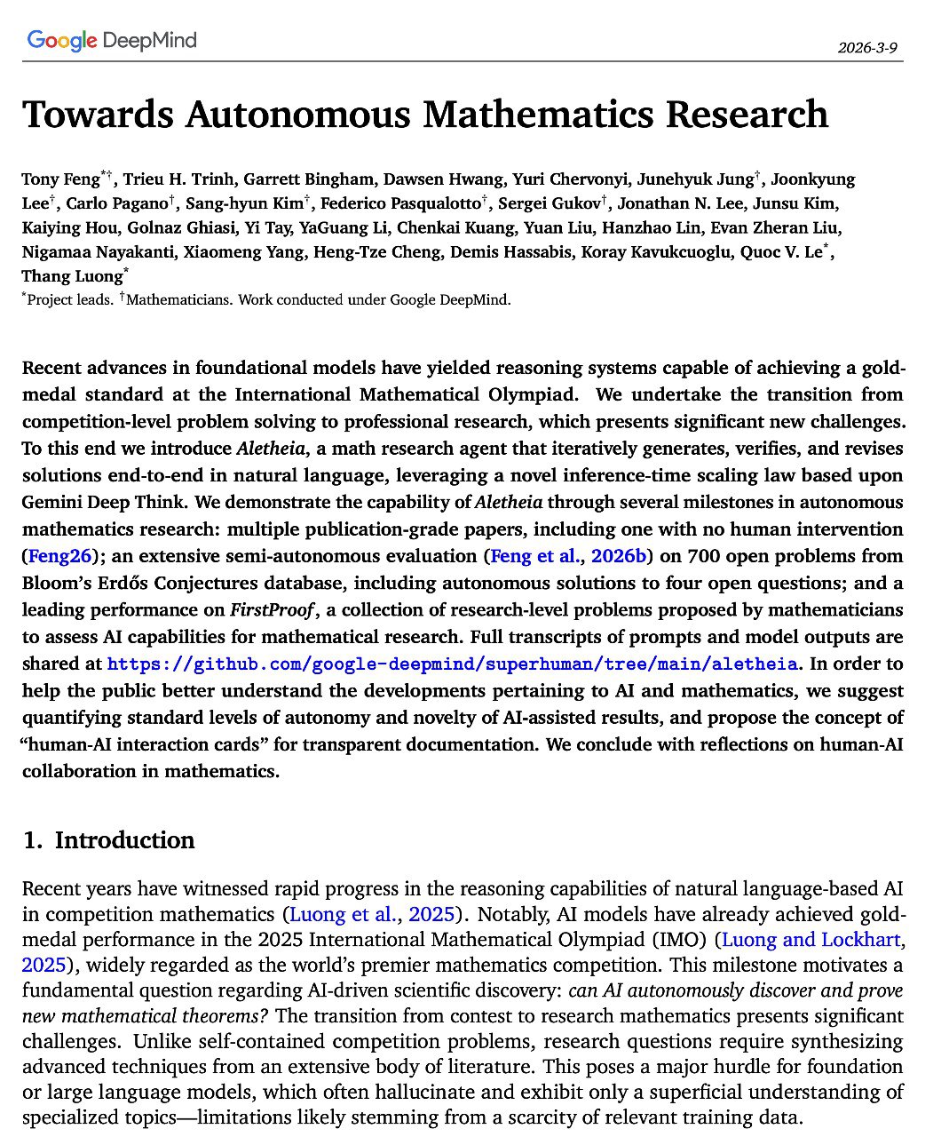 - Feng et al., “Towards Autonomous Mathematics Research”, Google DeepMind, March 2026.